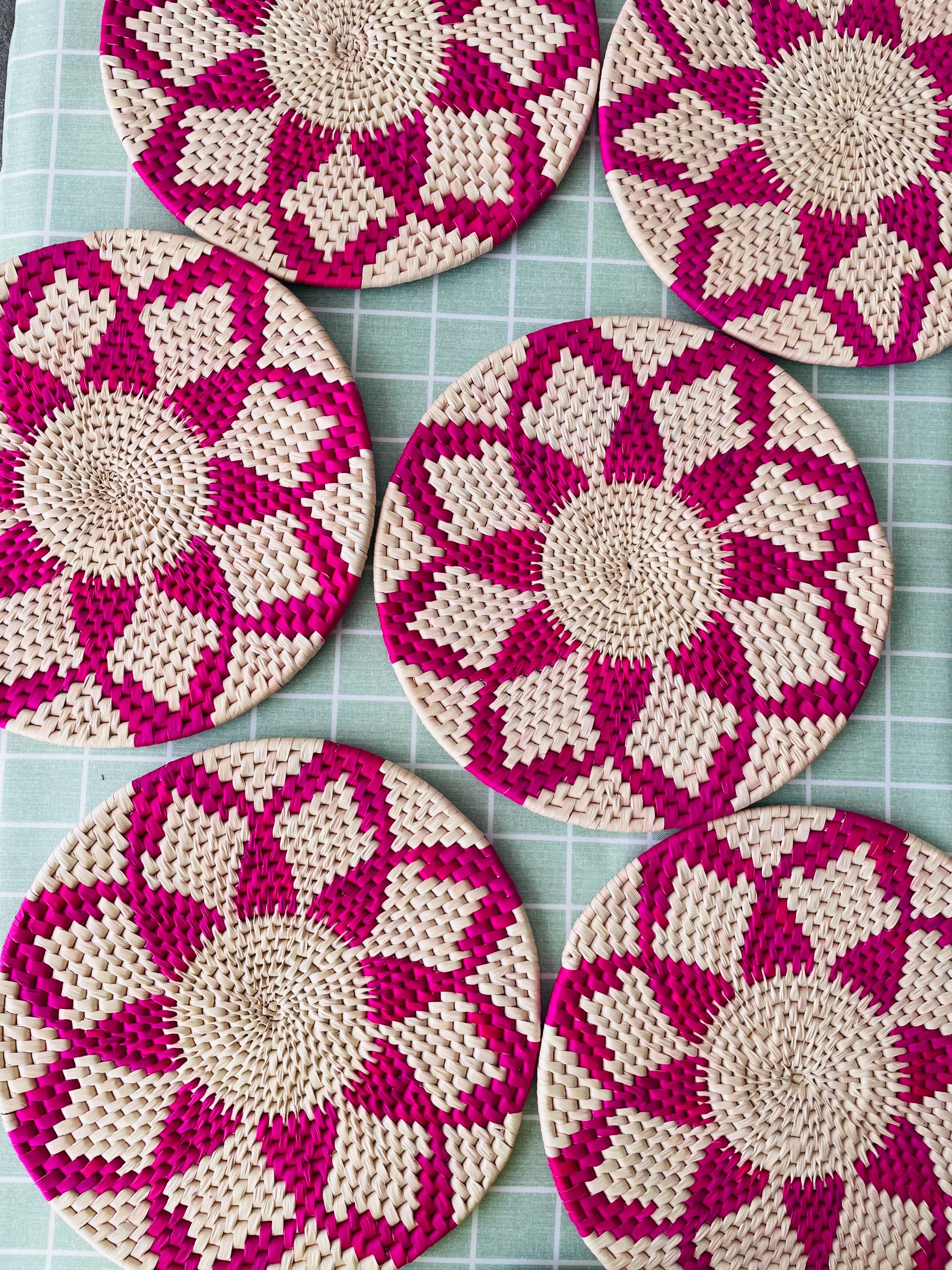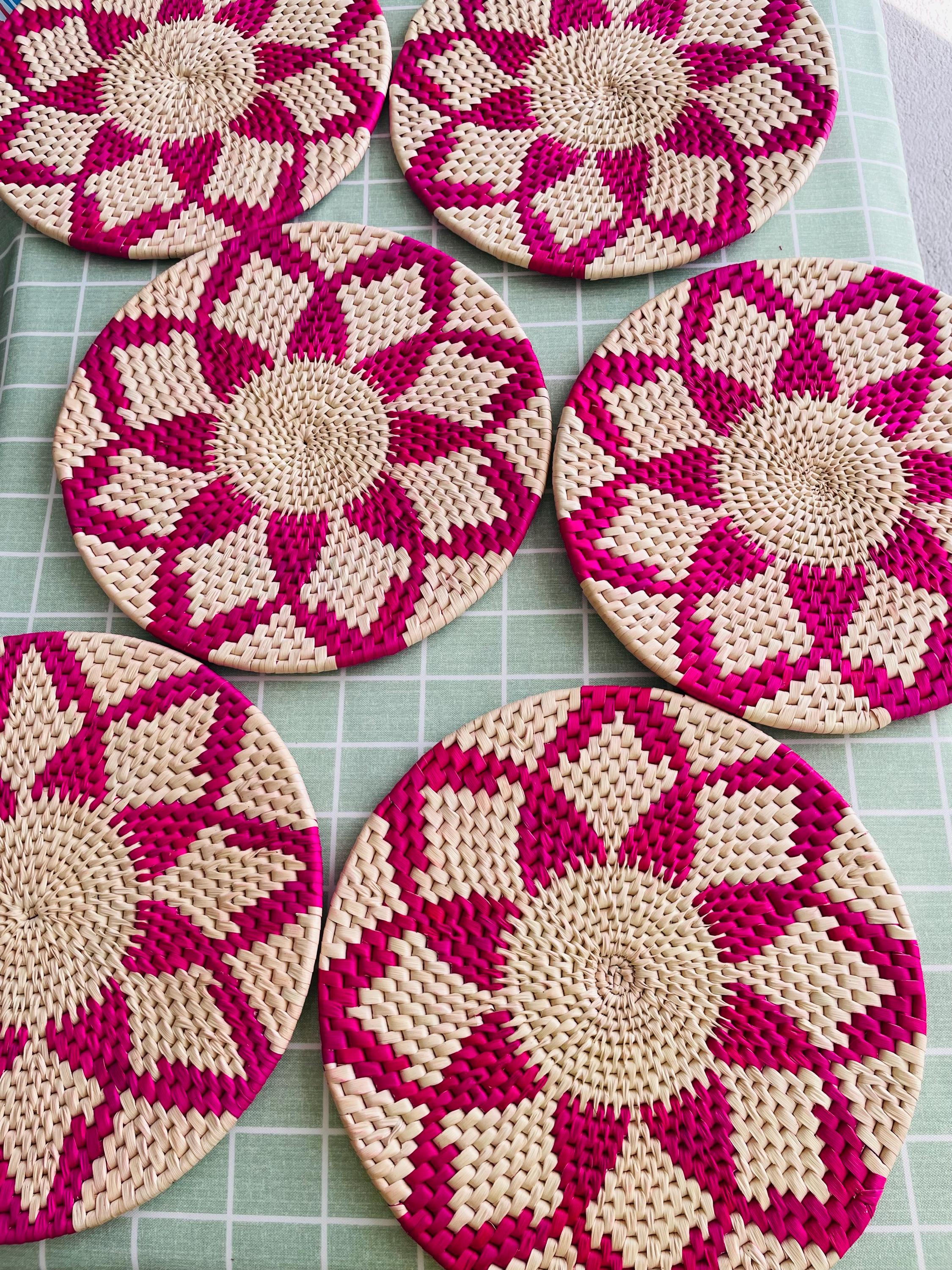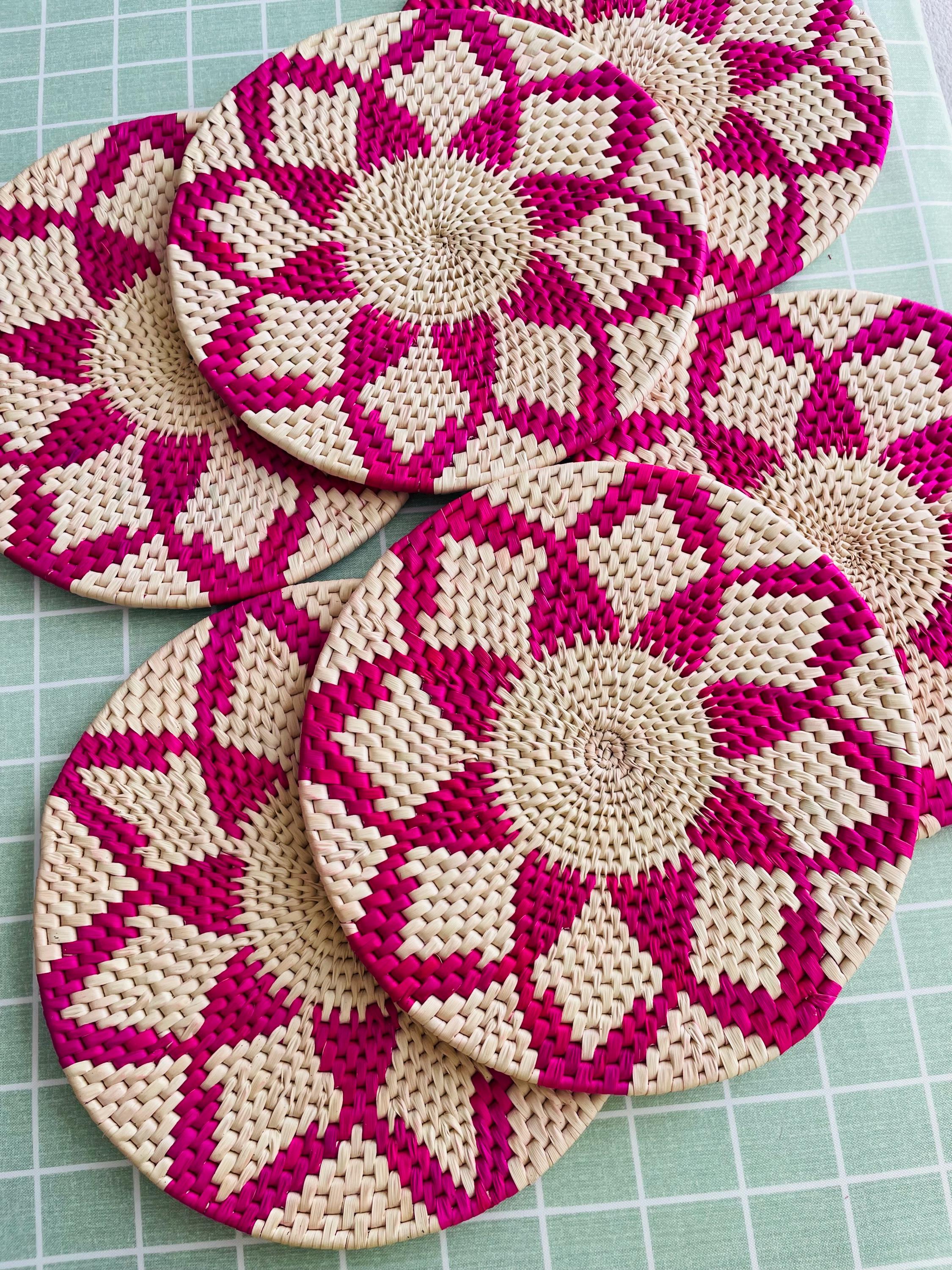 Each placemat is carefully crafted by skilled artisans and features a vibrant pink and natural color scheme that adds a pop of color to your dining room.