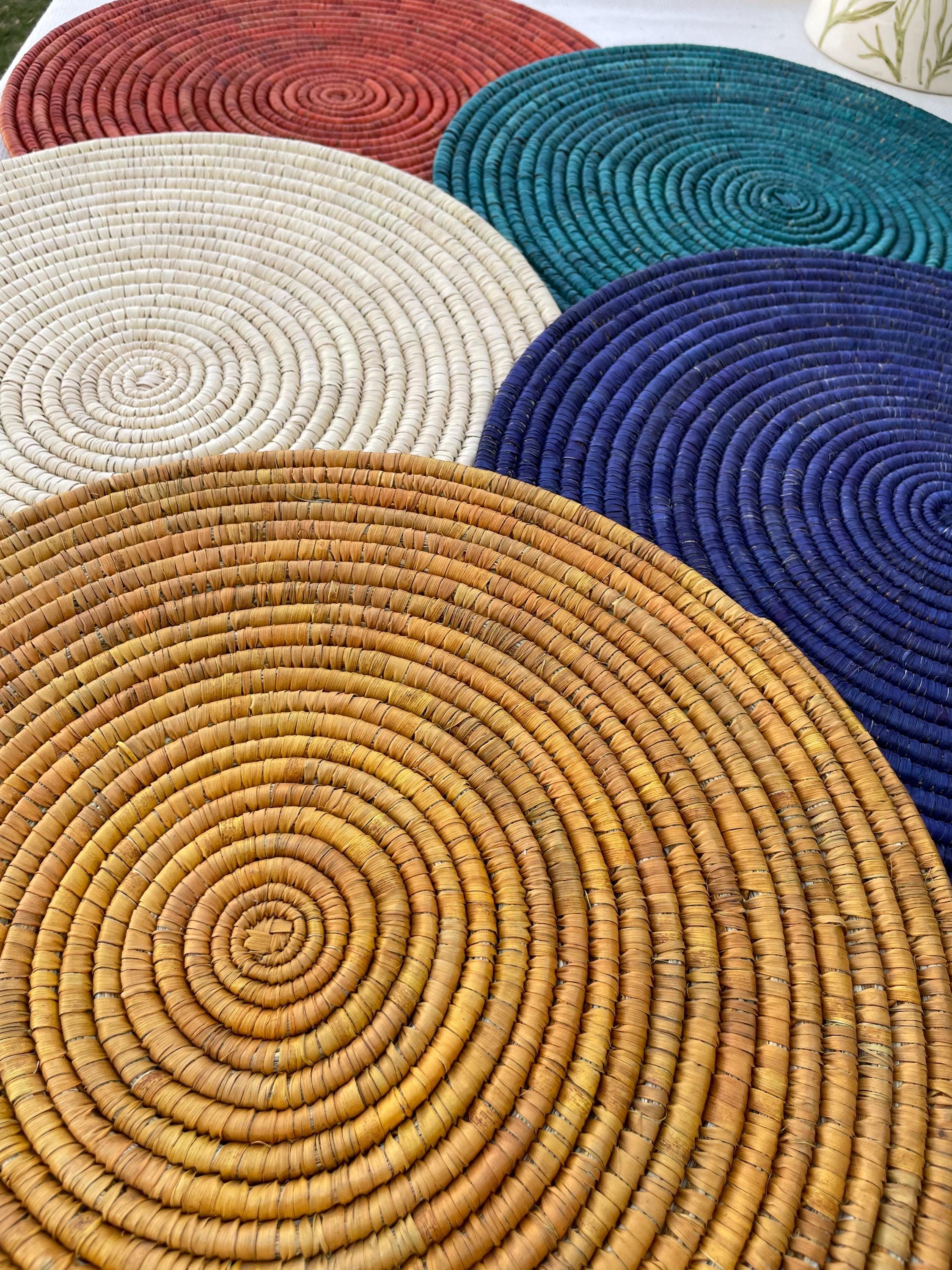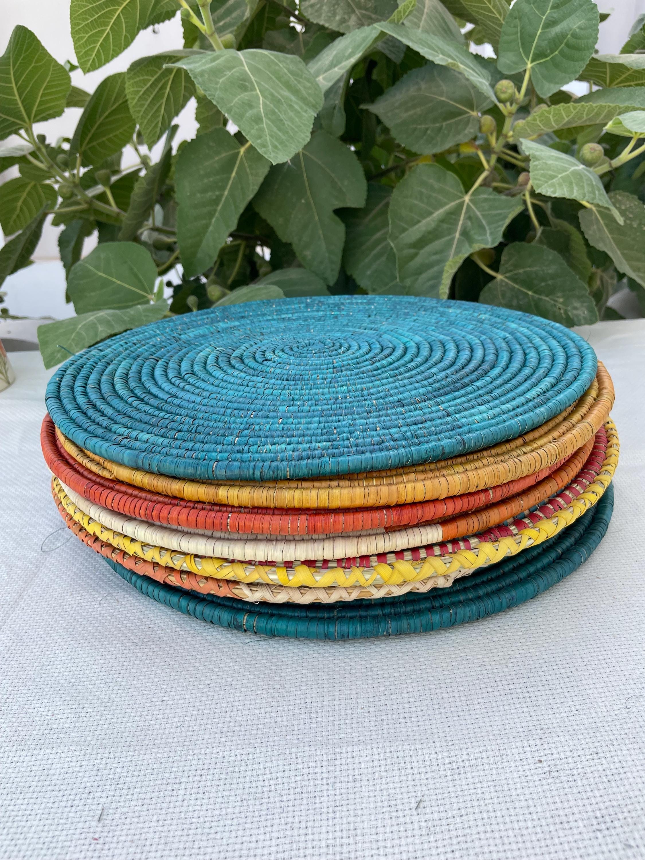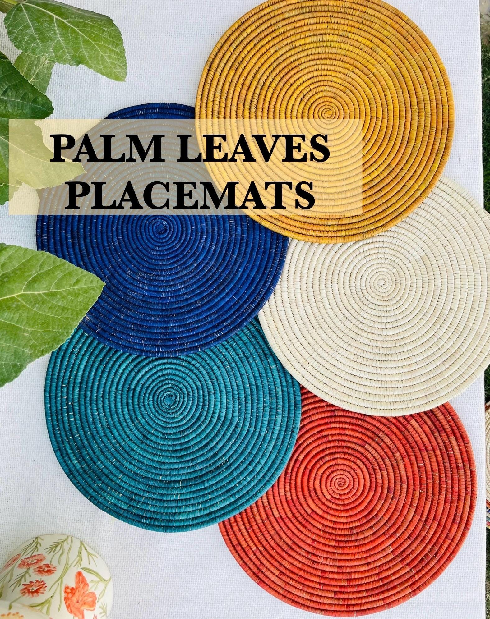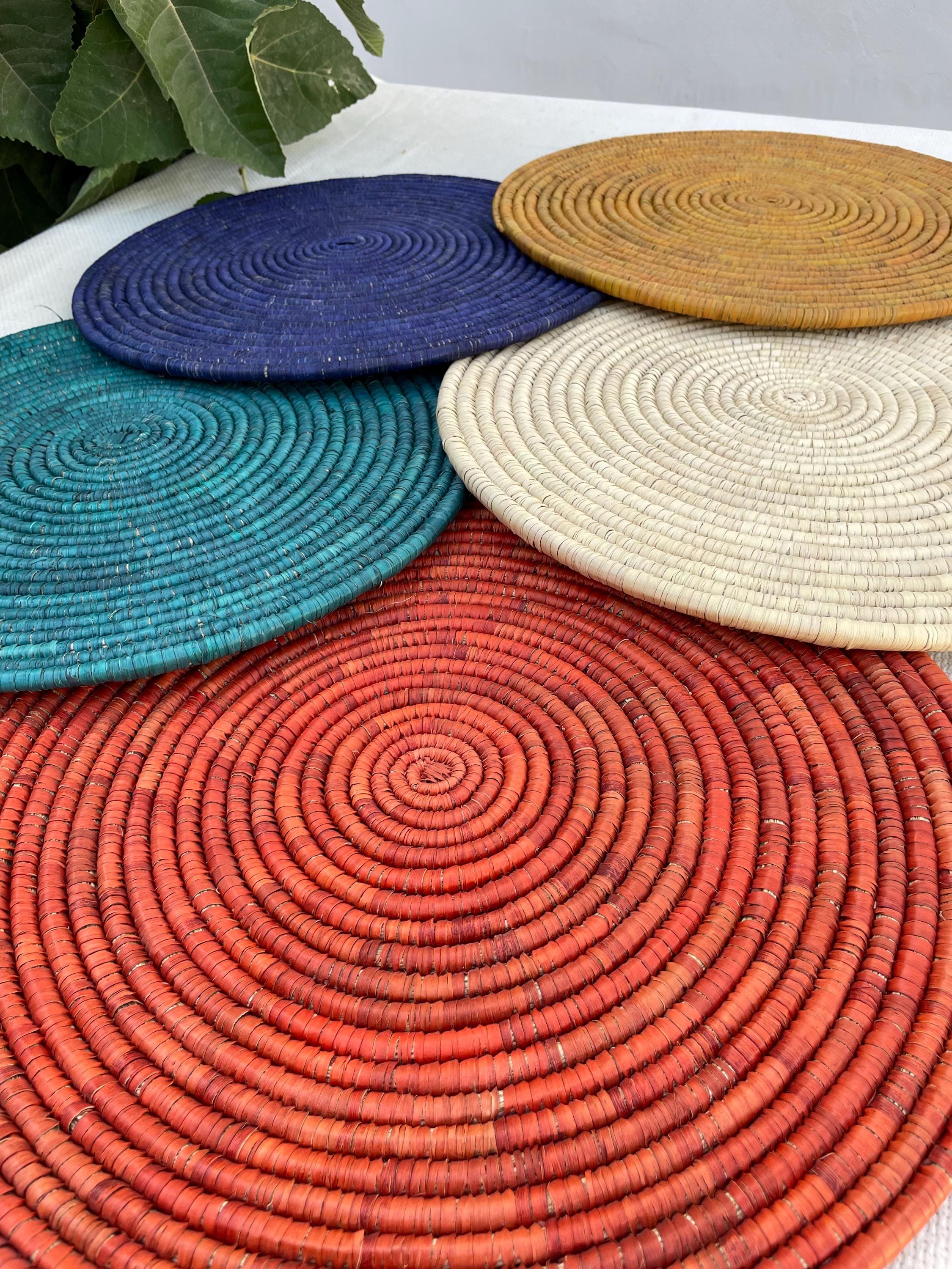 These hand woven round placemats is made from date palm fiber gathered from the various palm plantations that surround the artisans' village.
