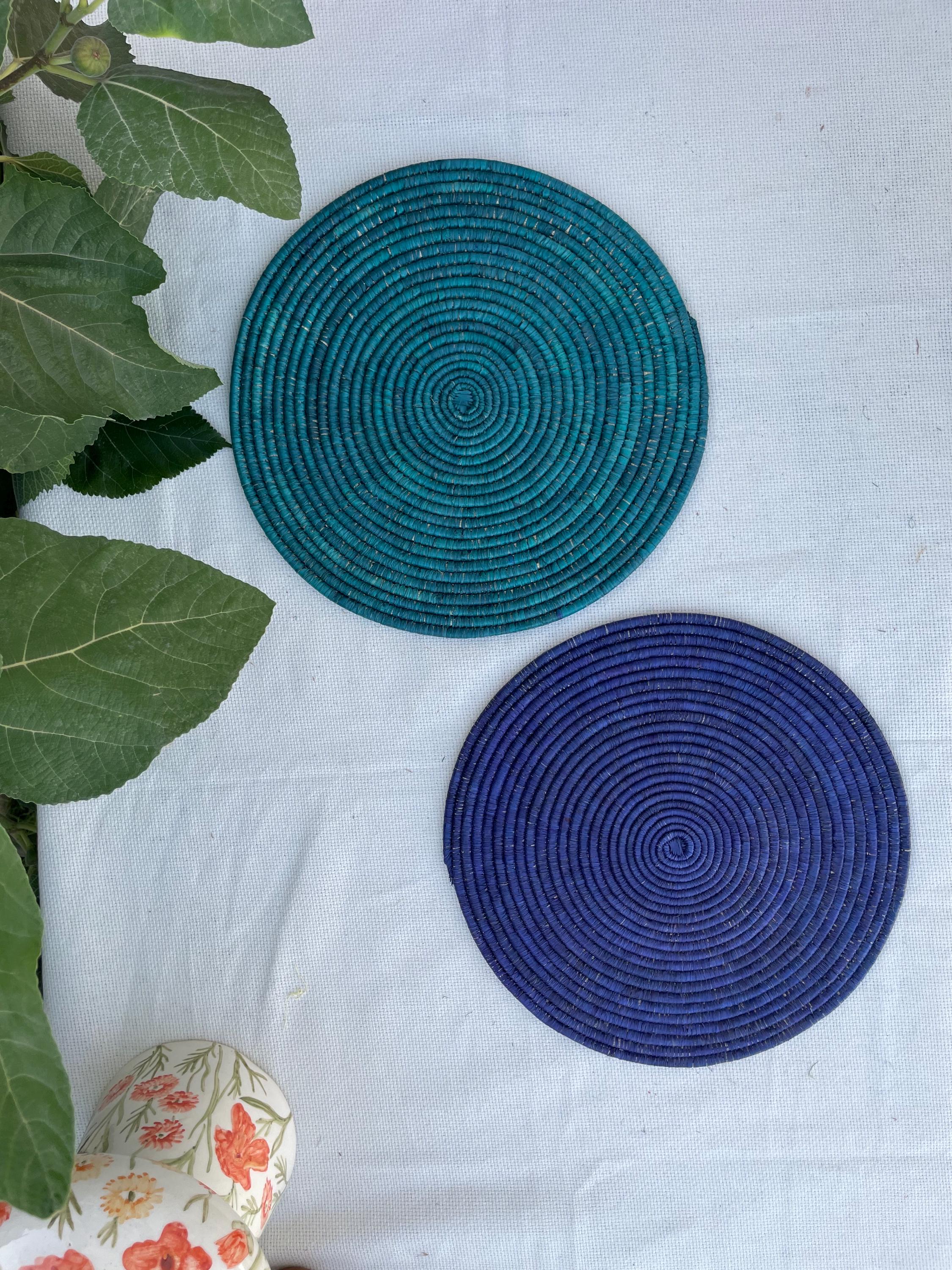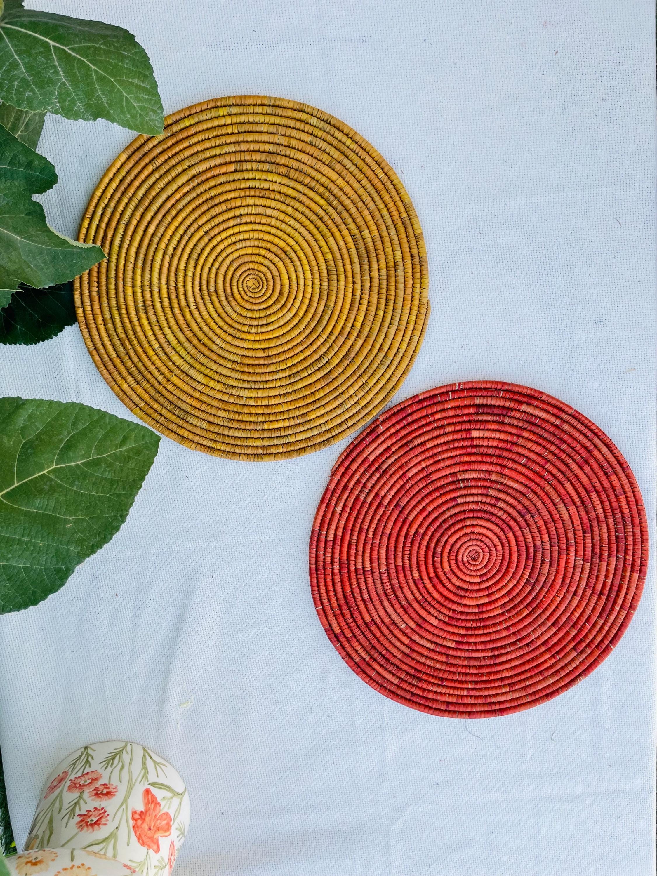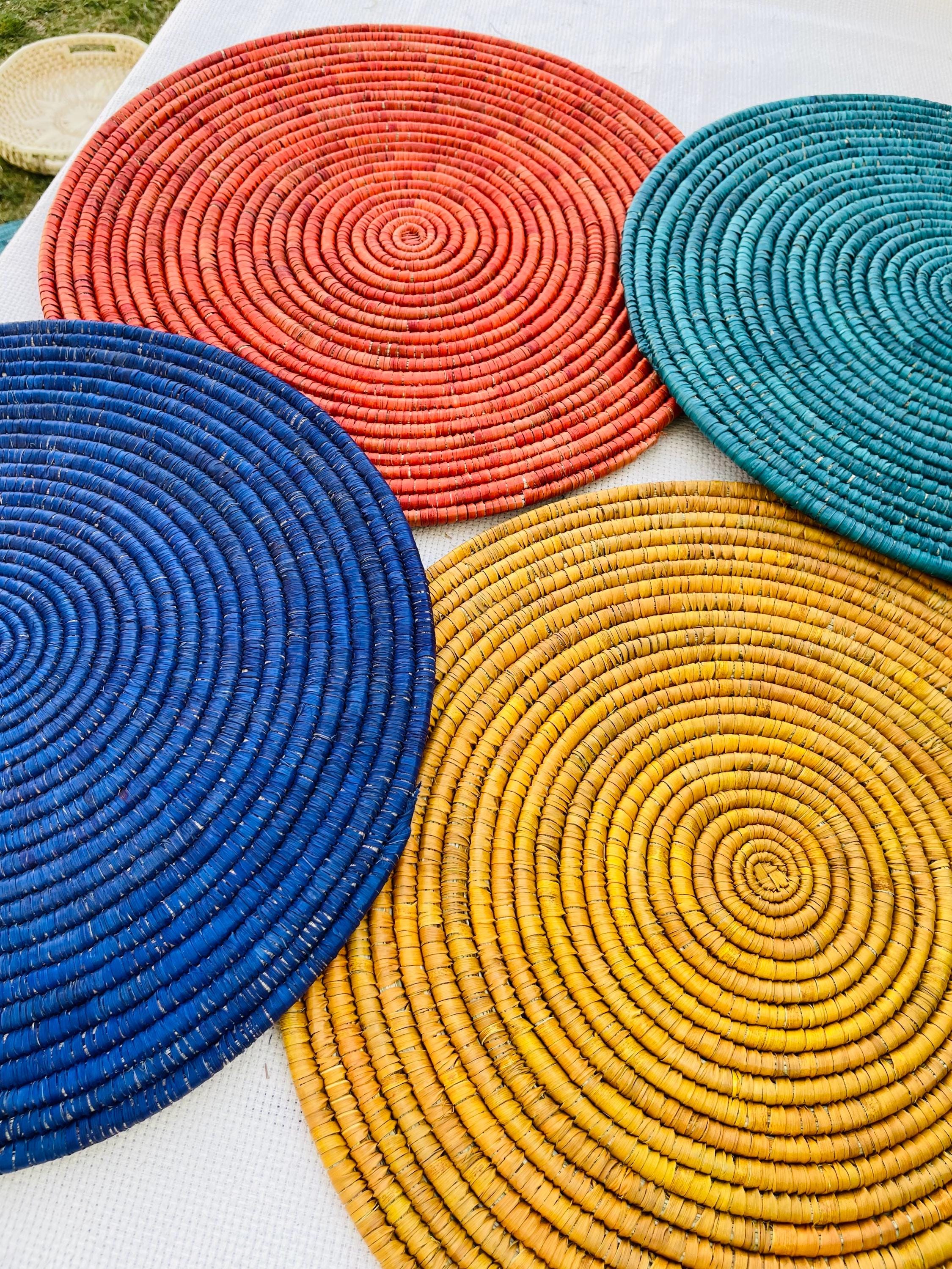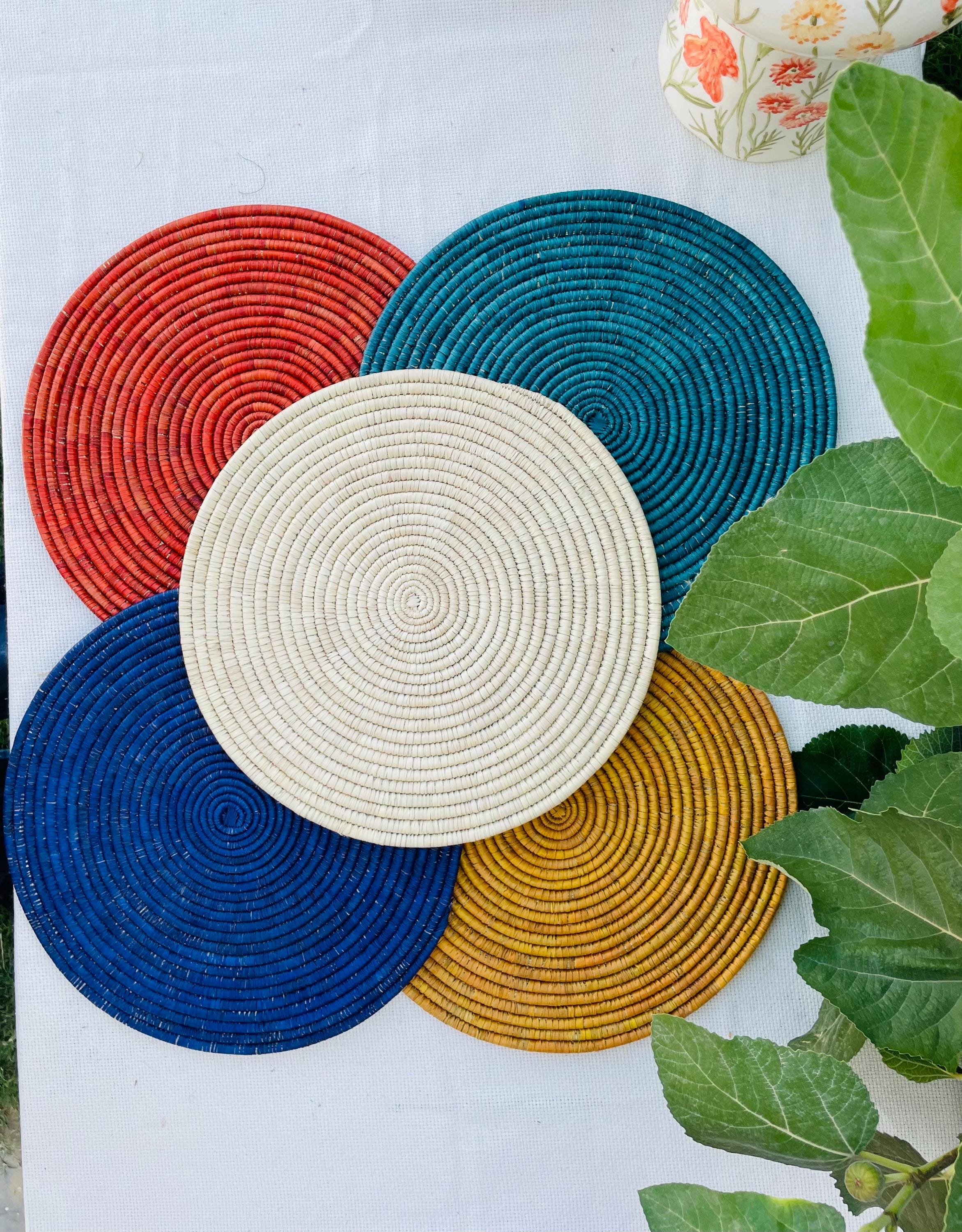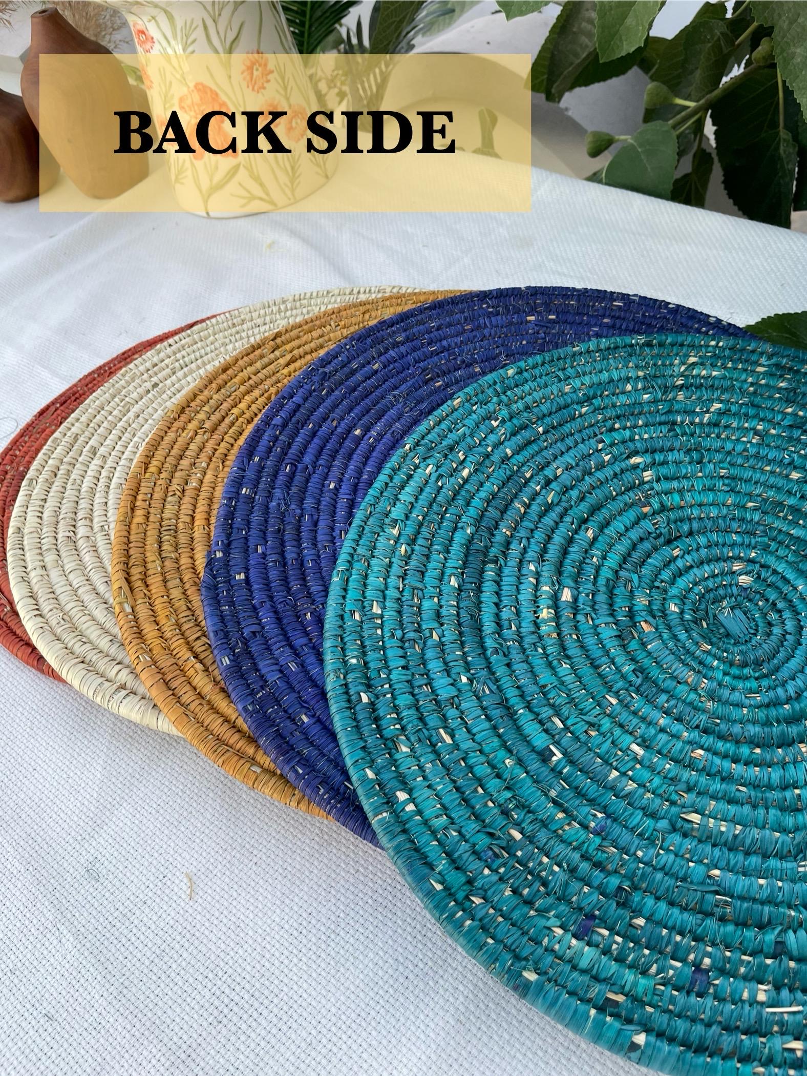 These hand woven round placemats is made from date palm fiber gathered from the various palm plantations that surround the artisans' village.