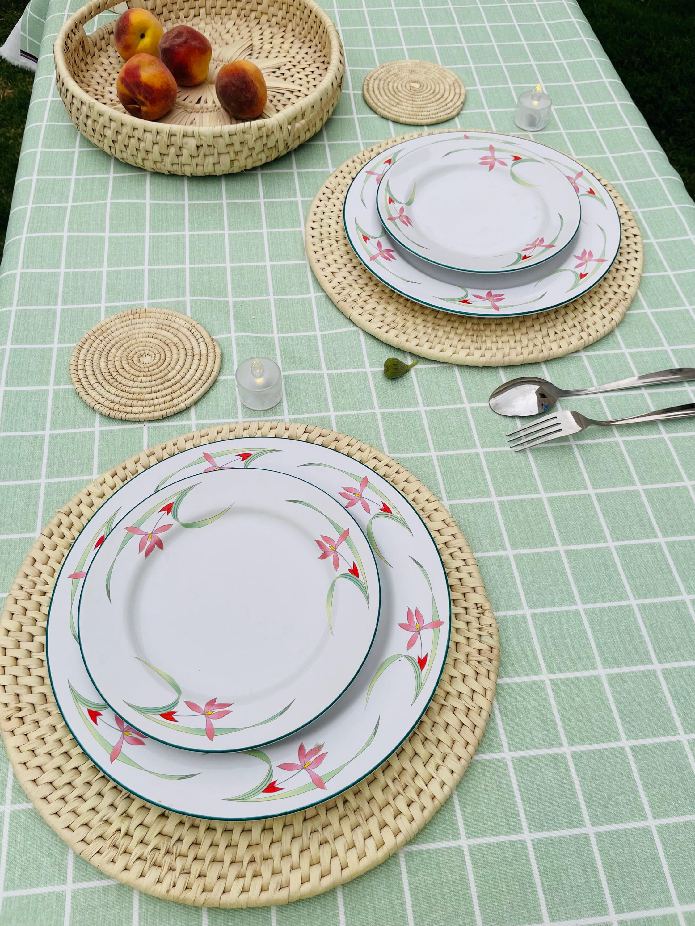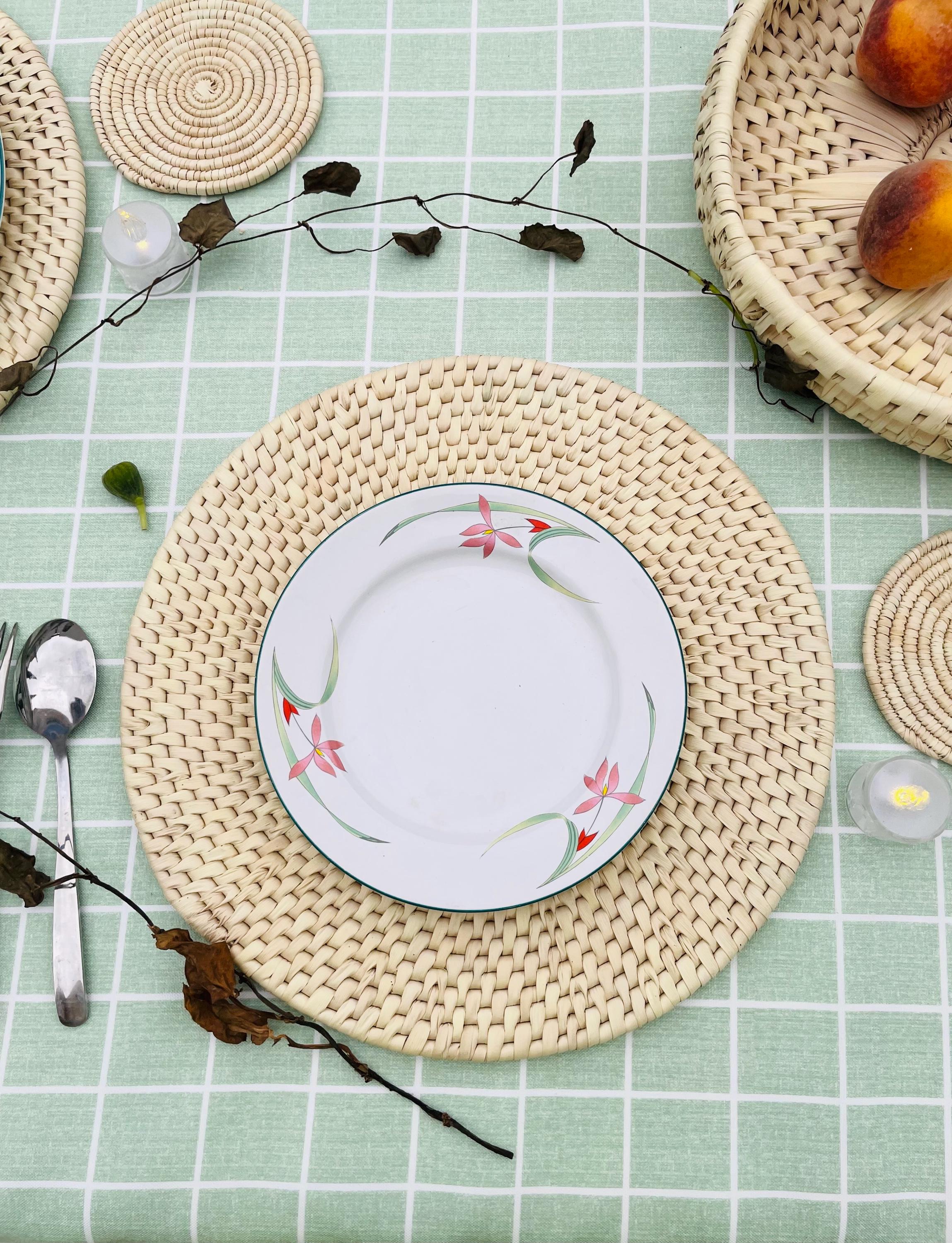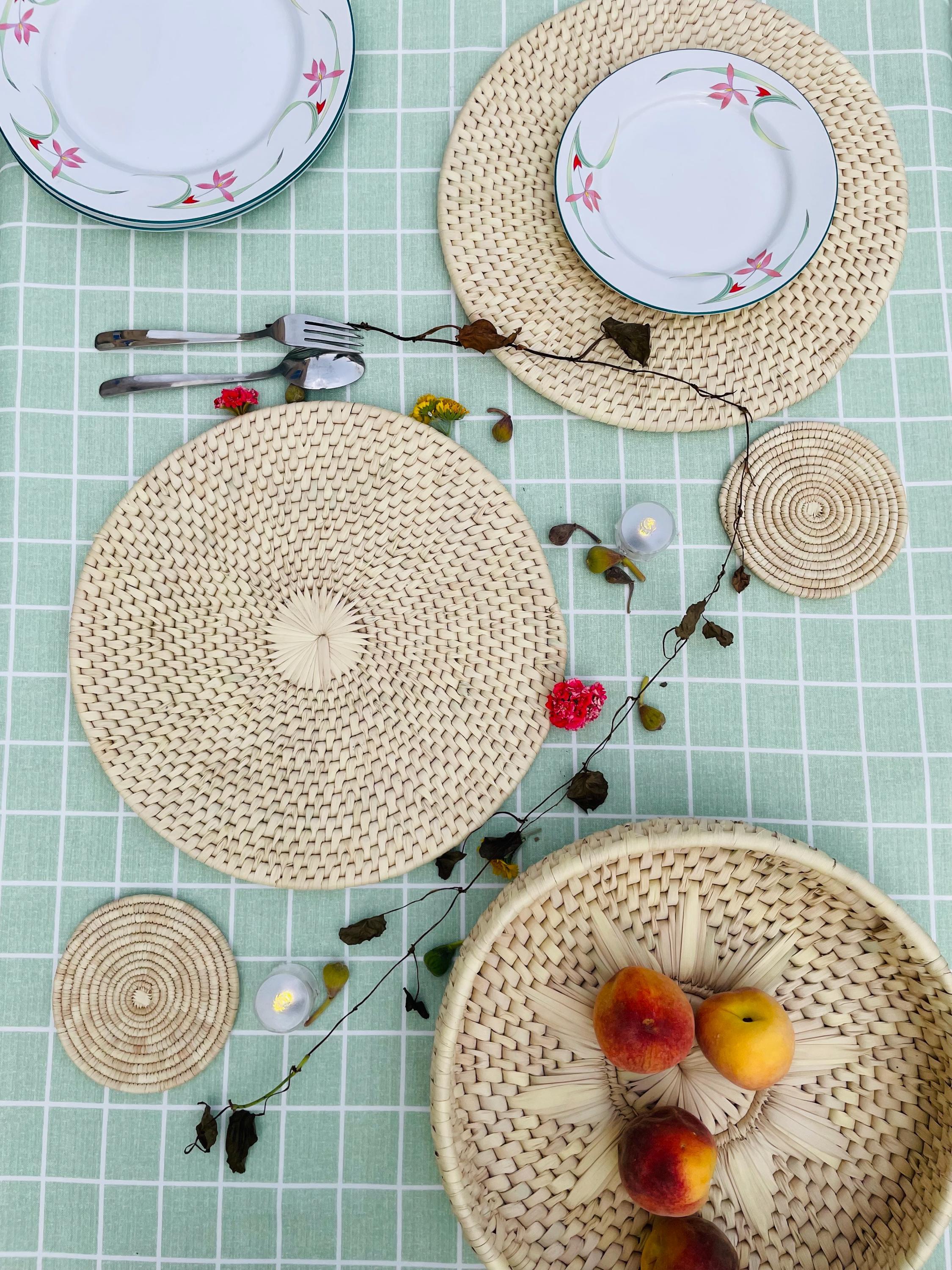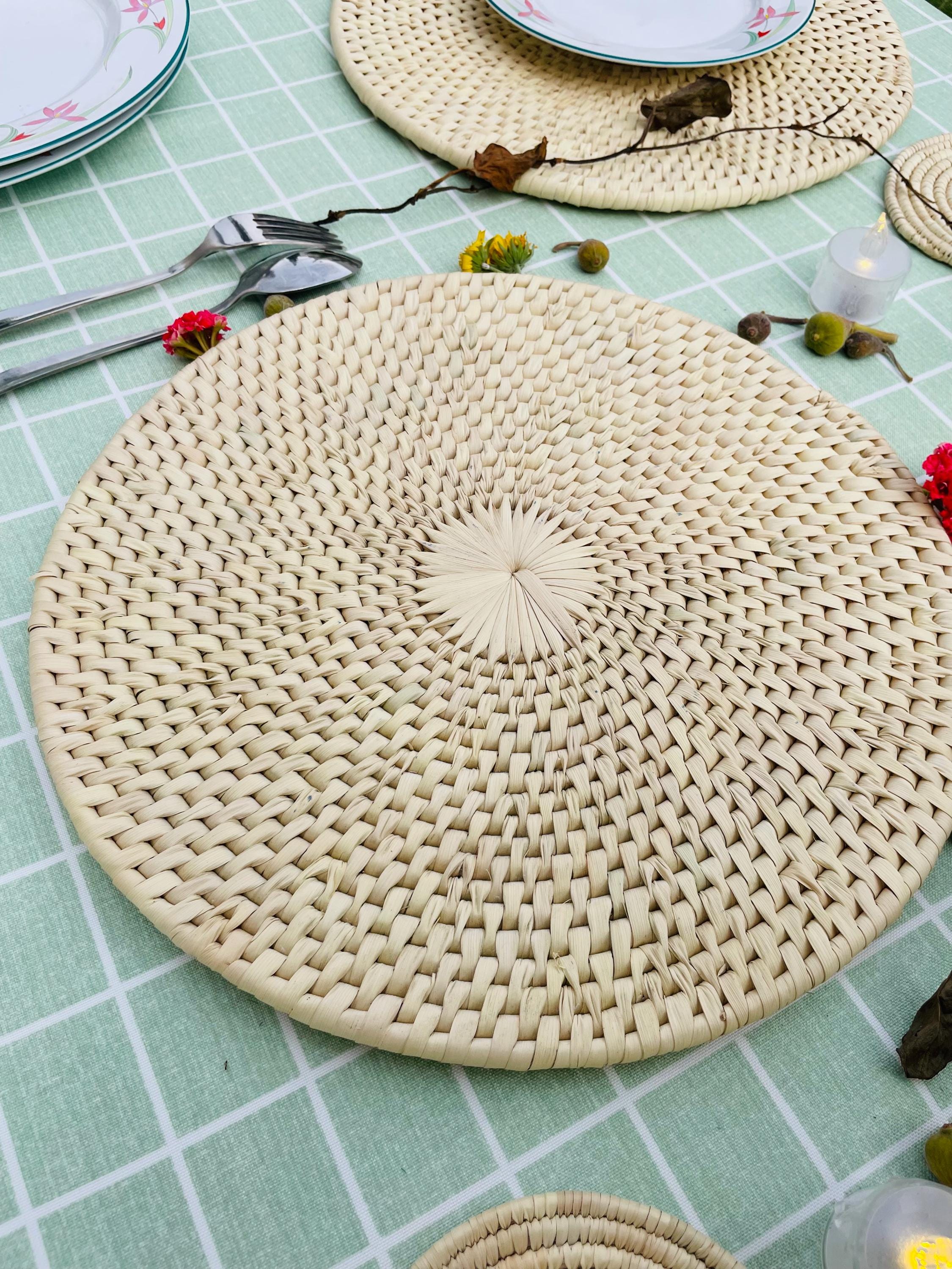 natural round Placemats are an easy way to elevate your table from everyday meals to special occasions. These classic, simple, and elegant placemats are use it as table centerpiece, dining table mat, a side table mat, console mat, farmhouse dining decor, or a garden party table decor and also add a charming touch to festive settings like Easter or weddings.