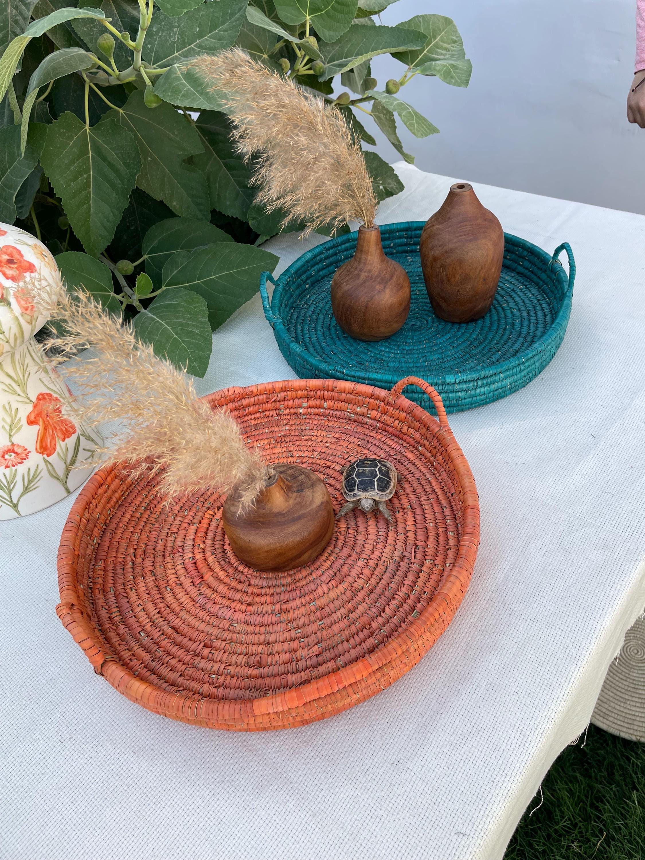 rustic round tray are an easy way to elevate your table from everyday meals to special occasions. These classic, simple, and vintage style round tray are use it as table centerpiece, a serving tray, fruit tray, organizer tray, farmhouse dining decor, coastal table decor, rustic table decor or a garden party table decor and also add a charming touch to festive settings like Easter or weddings.