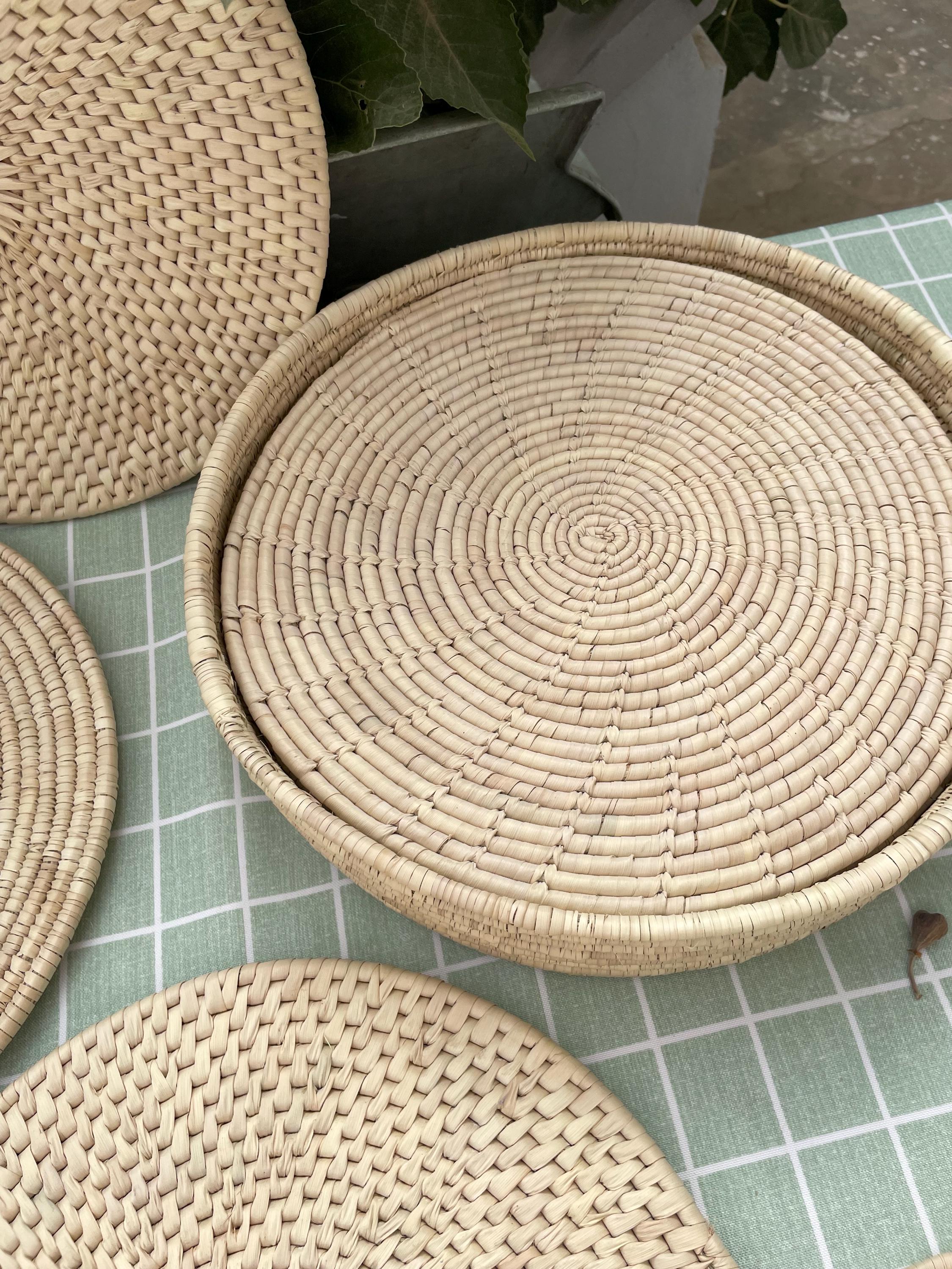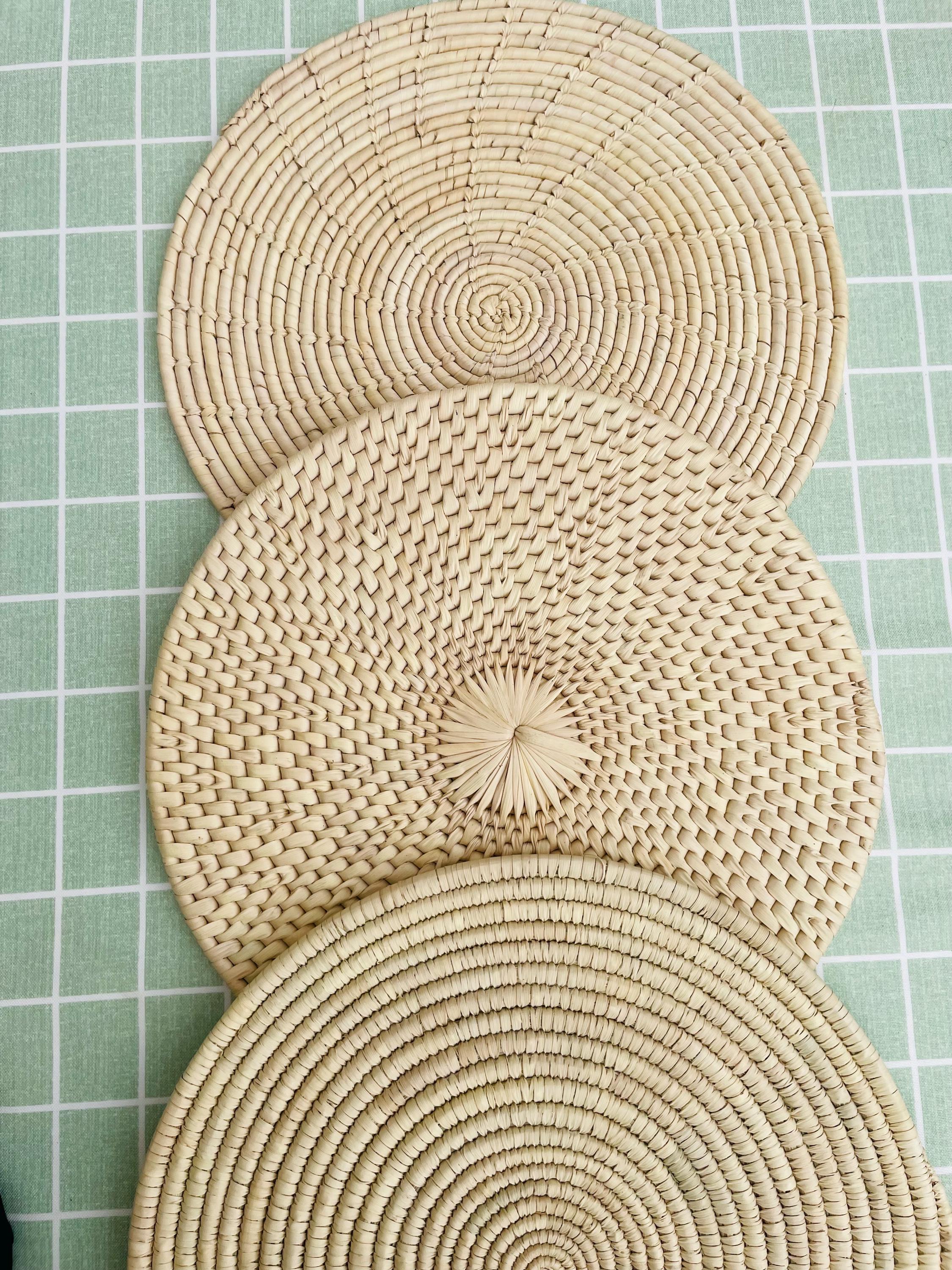 These woven round placemats is made from date palm fiber gathered from the various palm plantations that surround the artisans' village.
