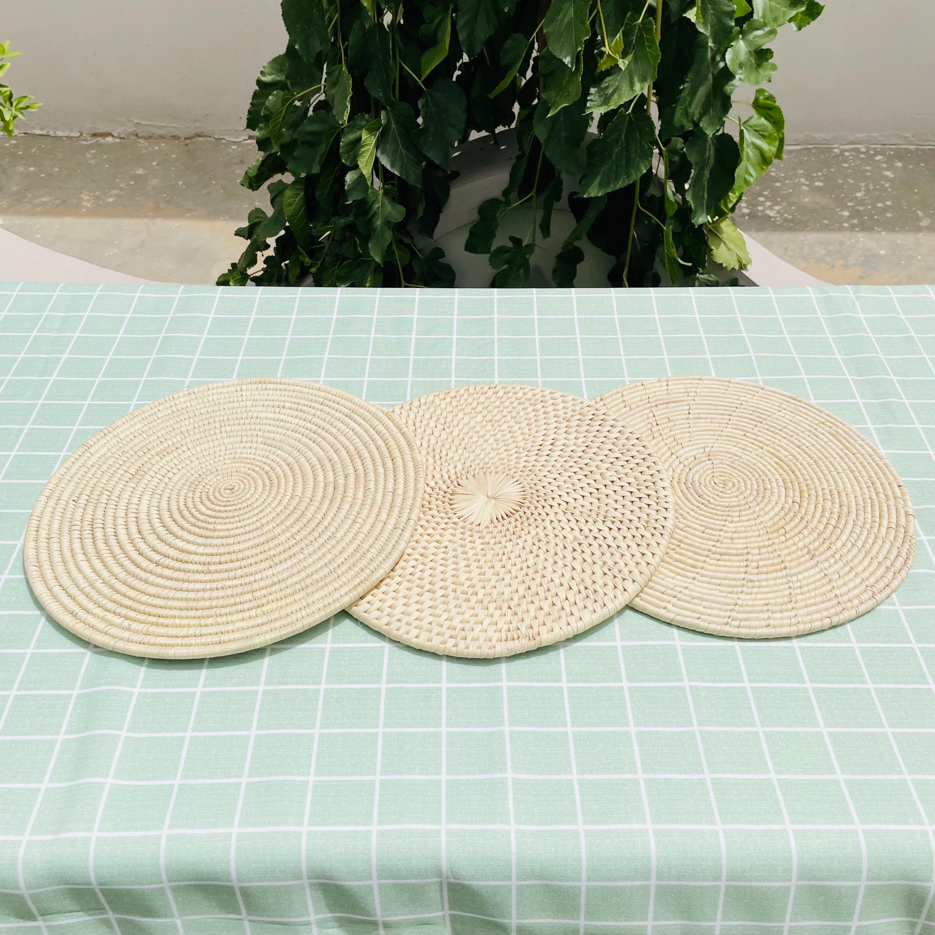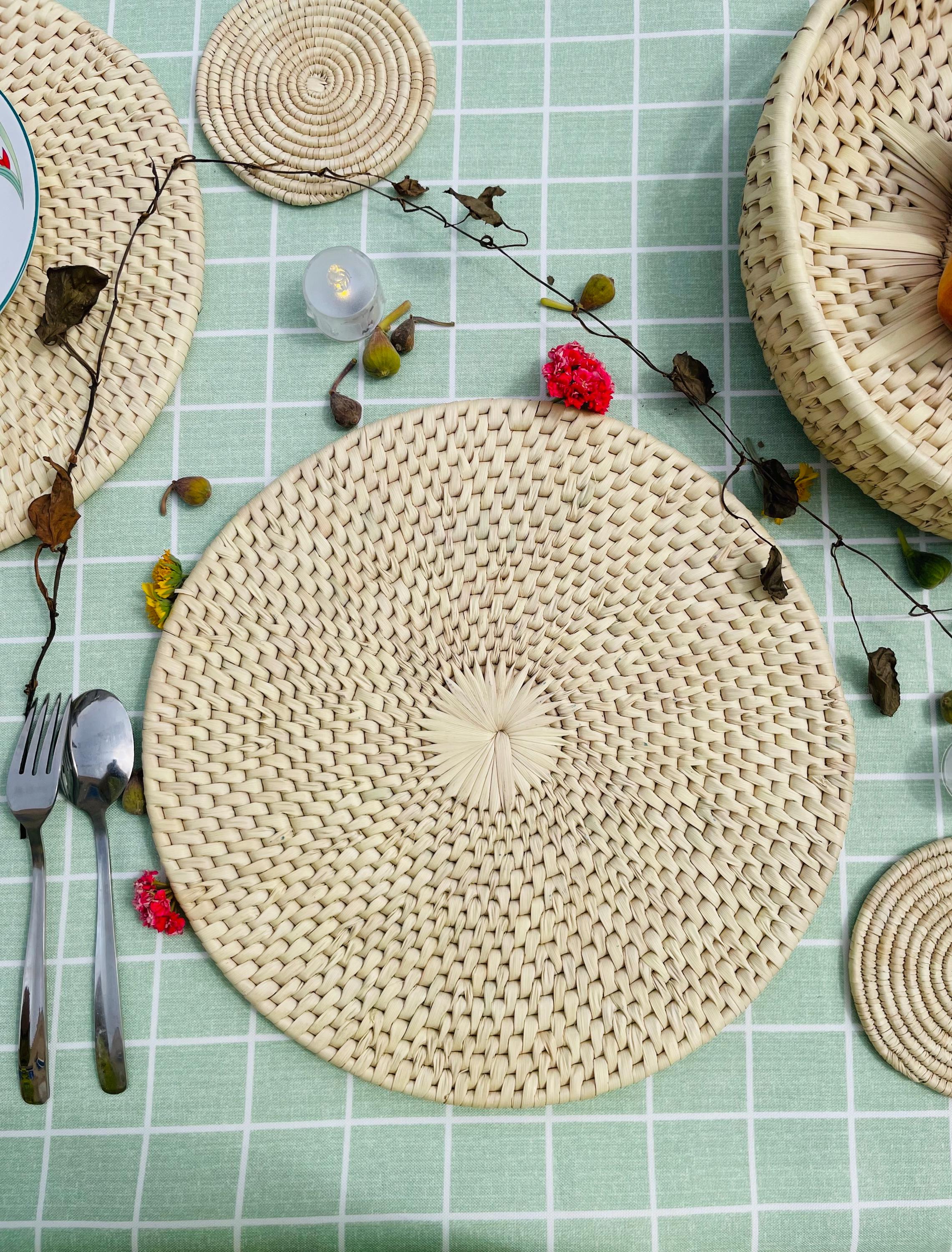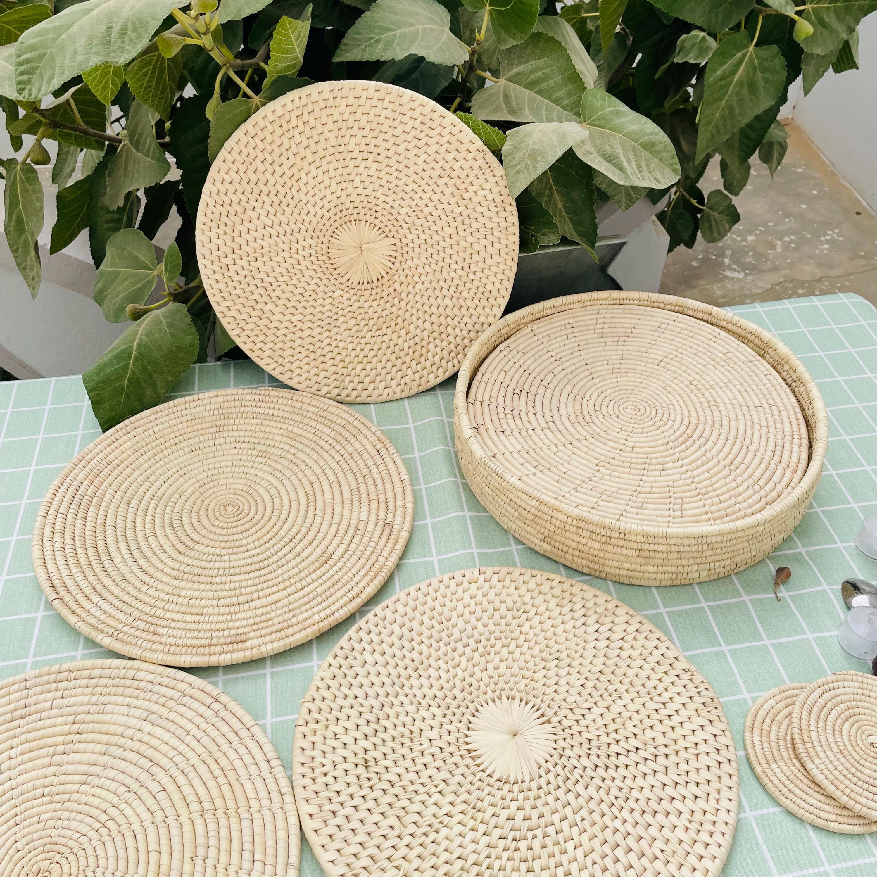 Palm round Placemats are an easy way to elevate your table from everyday meals to special occasions. These classic, simple, and elegant wicker placemats are use it as table centerpiece, dining table mat, a side table mat, console mat, farmhouse dining decor, or a garden party table decor and also add a charming touch to festive settings like Easter or weddings.