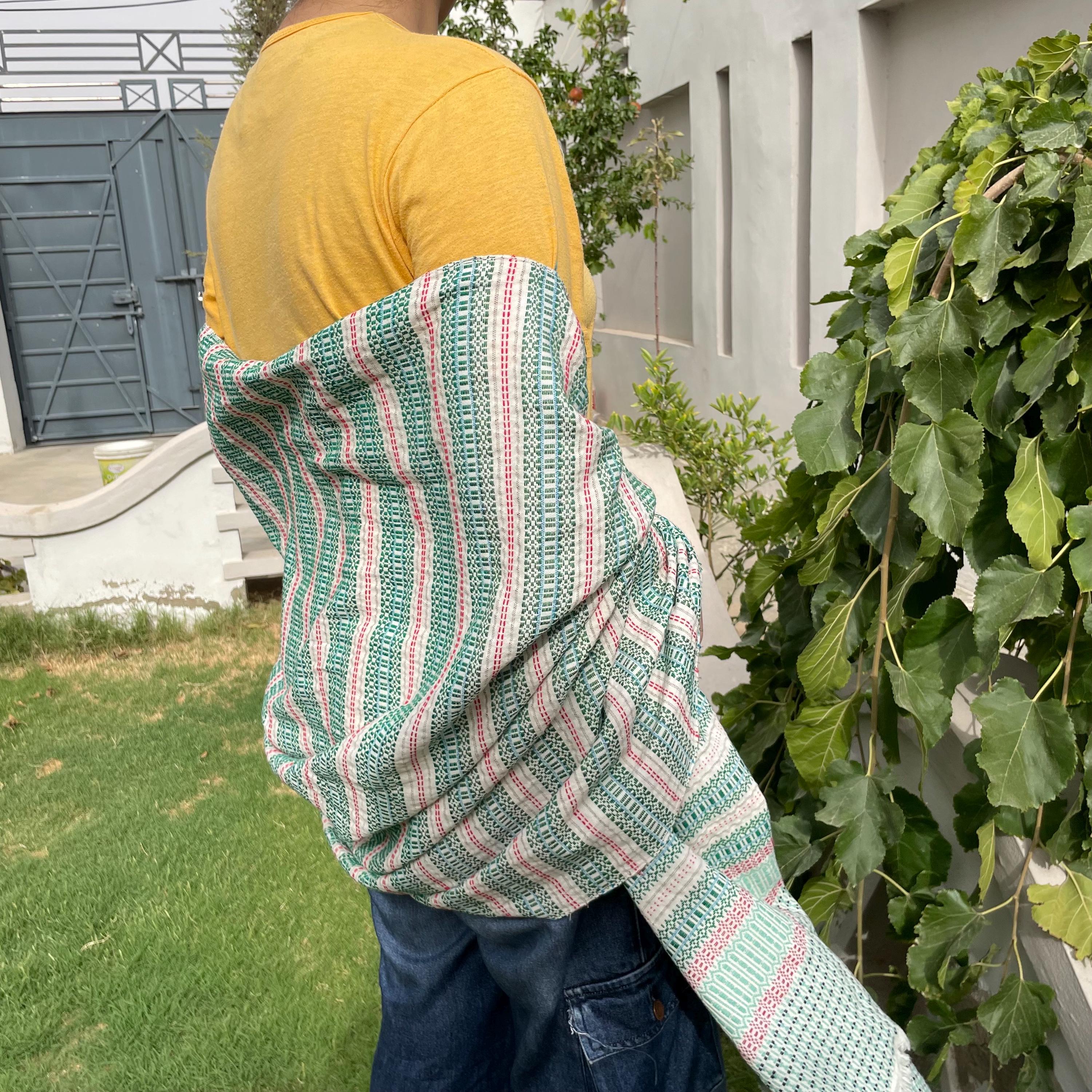 The Hand-Woven Rebozo shawl is cherished in the pakistani tradition. It is a versatile shawl worn by women who wrap it around their bodies. Its significance transcends cultural boundaries, as it finds practical application in pregnancy and childbirth.