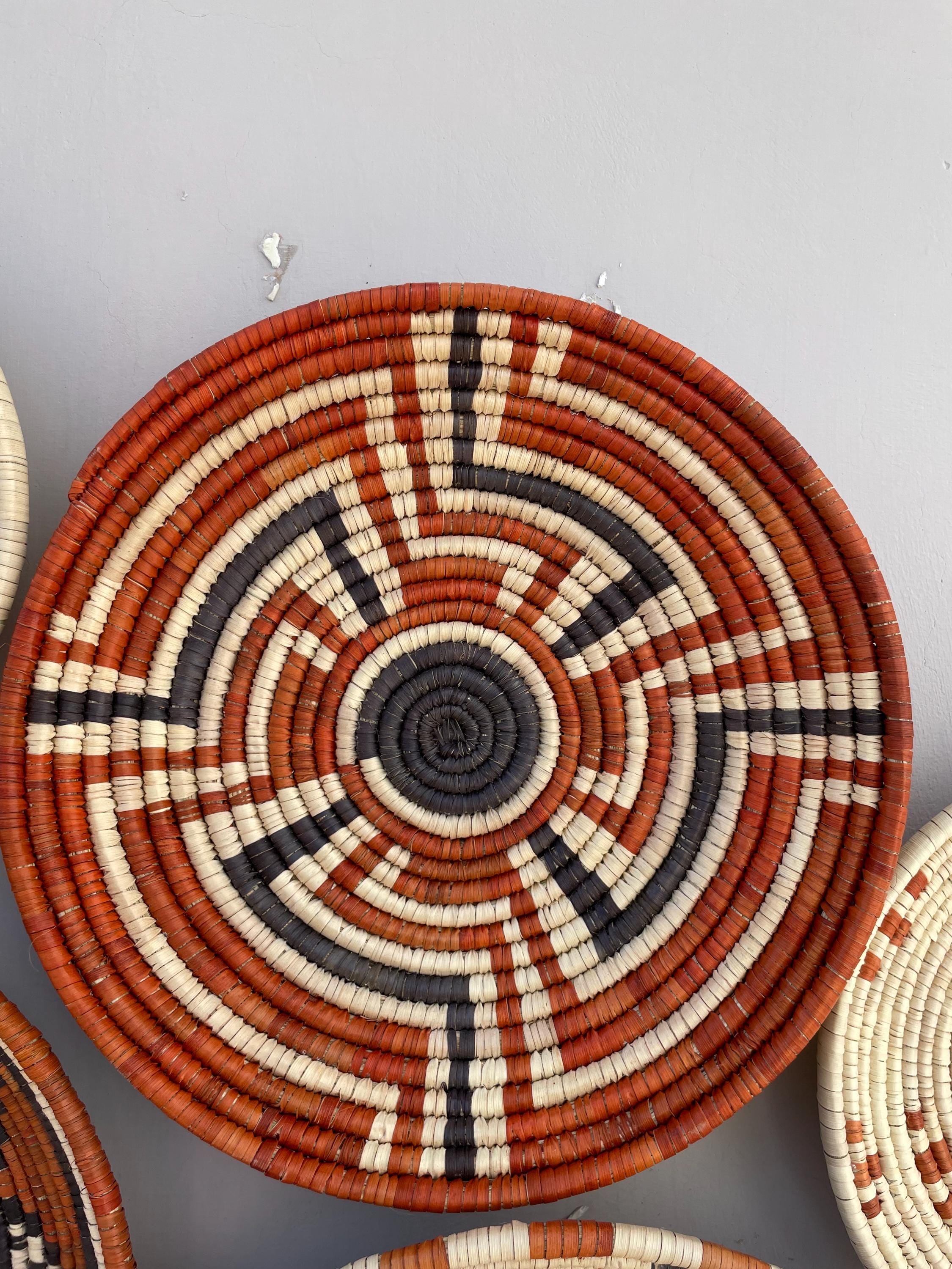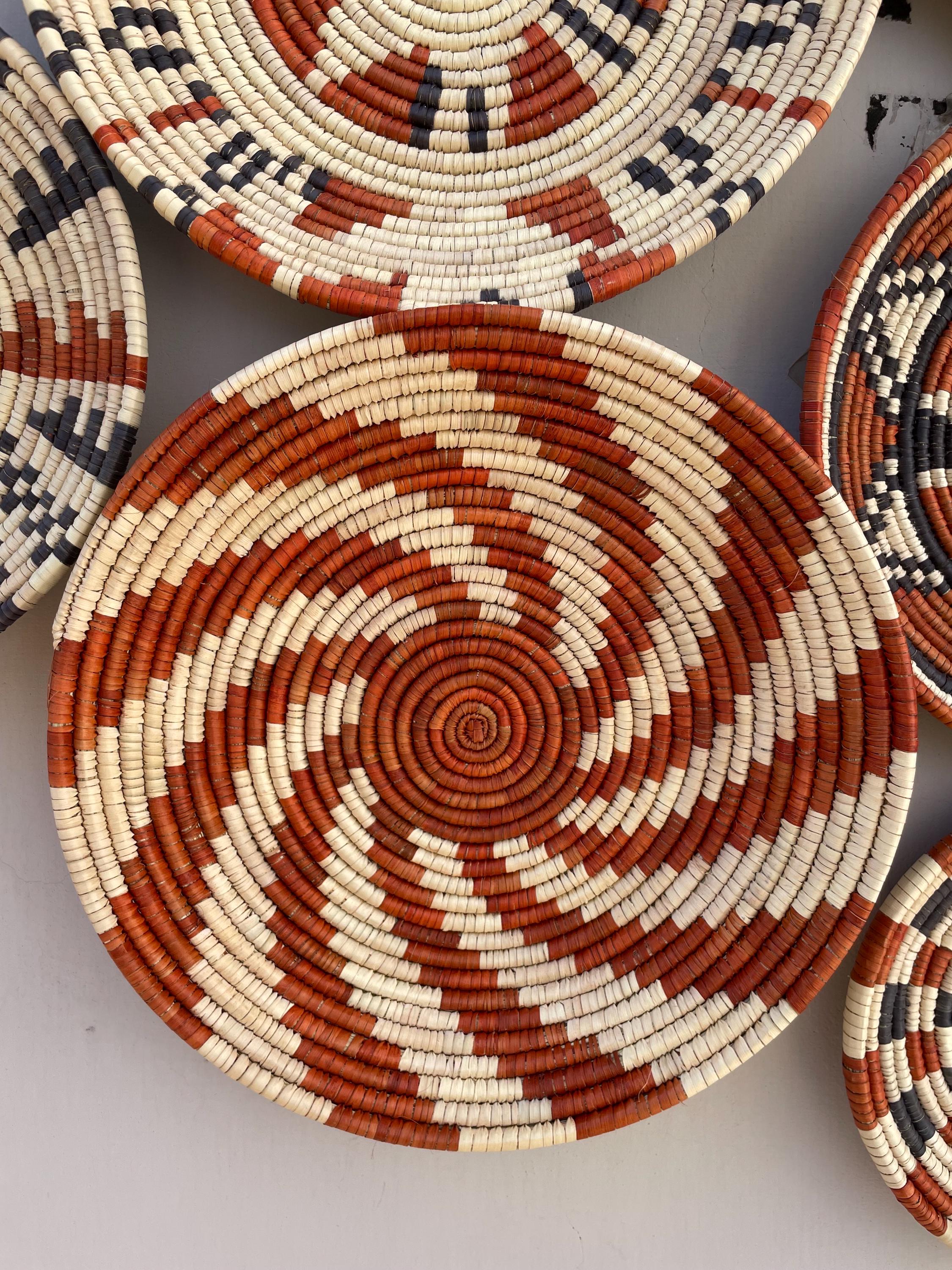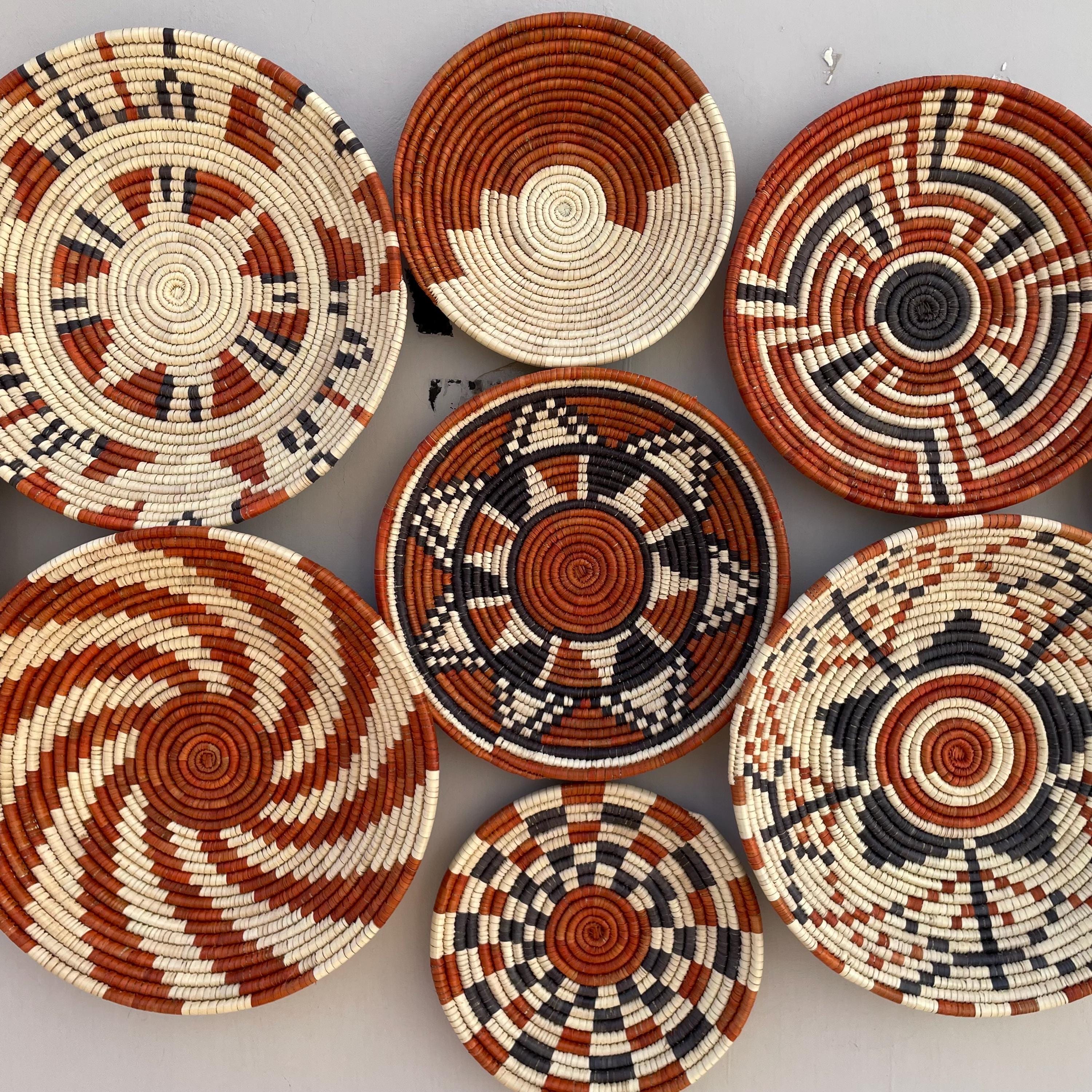 This set of nine boho wall baskets combines traditional craftsmanship with a contemporary aesthetic, featuring bold, striking patterns that bring an neutral colors to any room, these woven wall baskets add texture, depth, and a globally inspired touch to your decor.