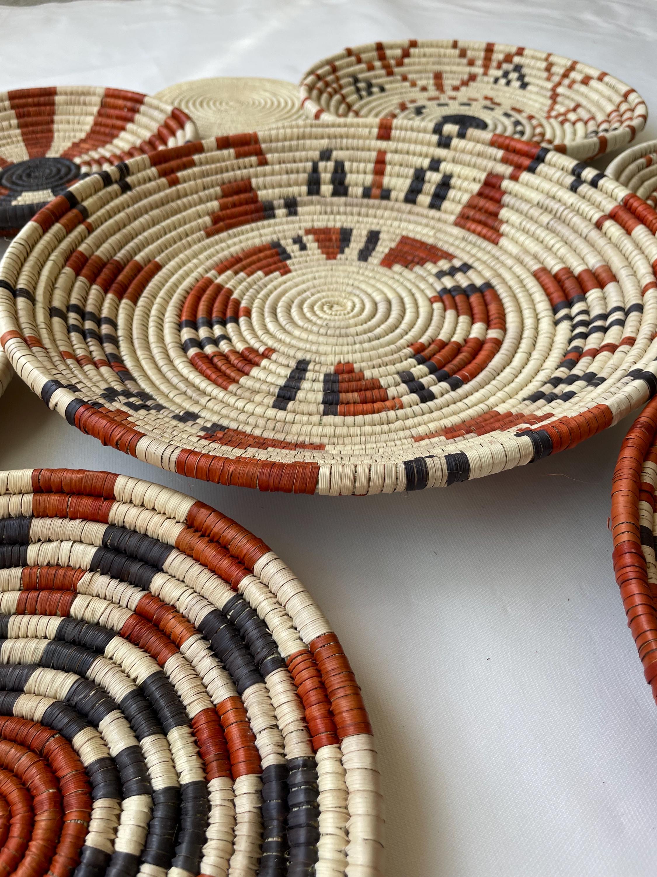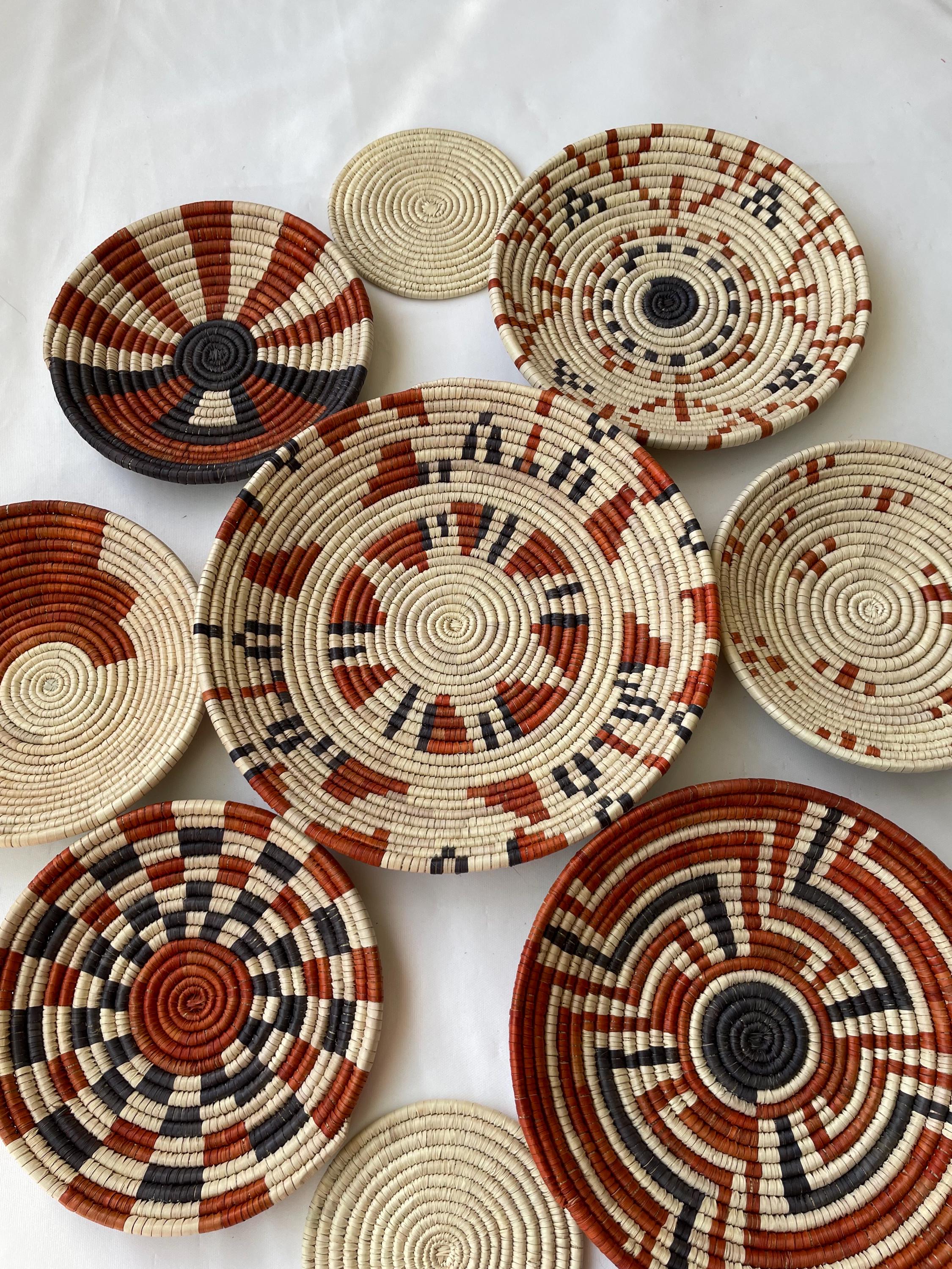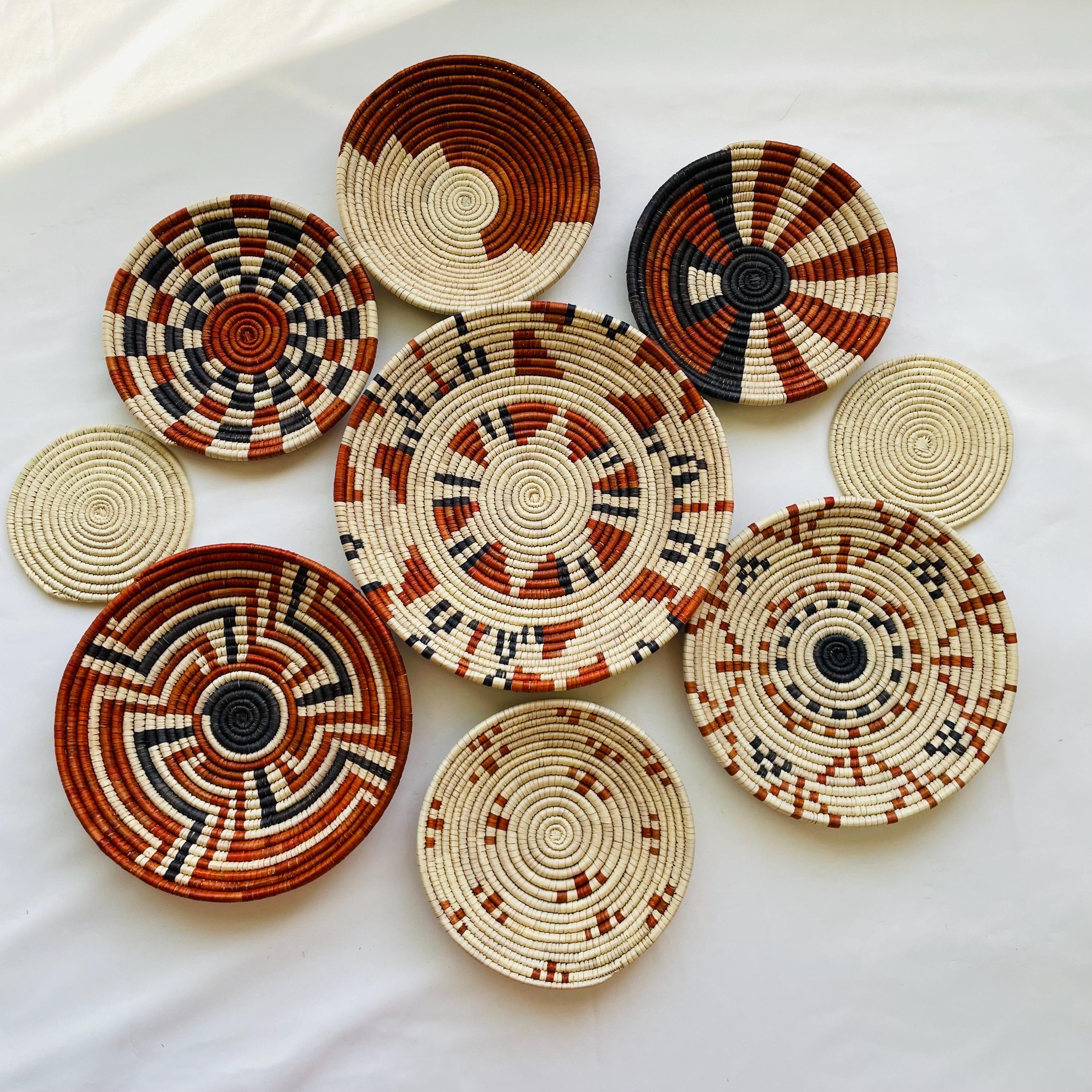 This set of nine boho wall baskets combines traditional craftsmanship with a contemporary aesthetic, featuring bold, striking patterns that bring an neutral colors to any room, these woven wall baskets add texture, depth, and a globally inspired touch to your decor.