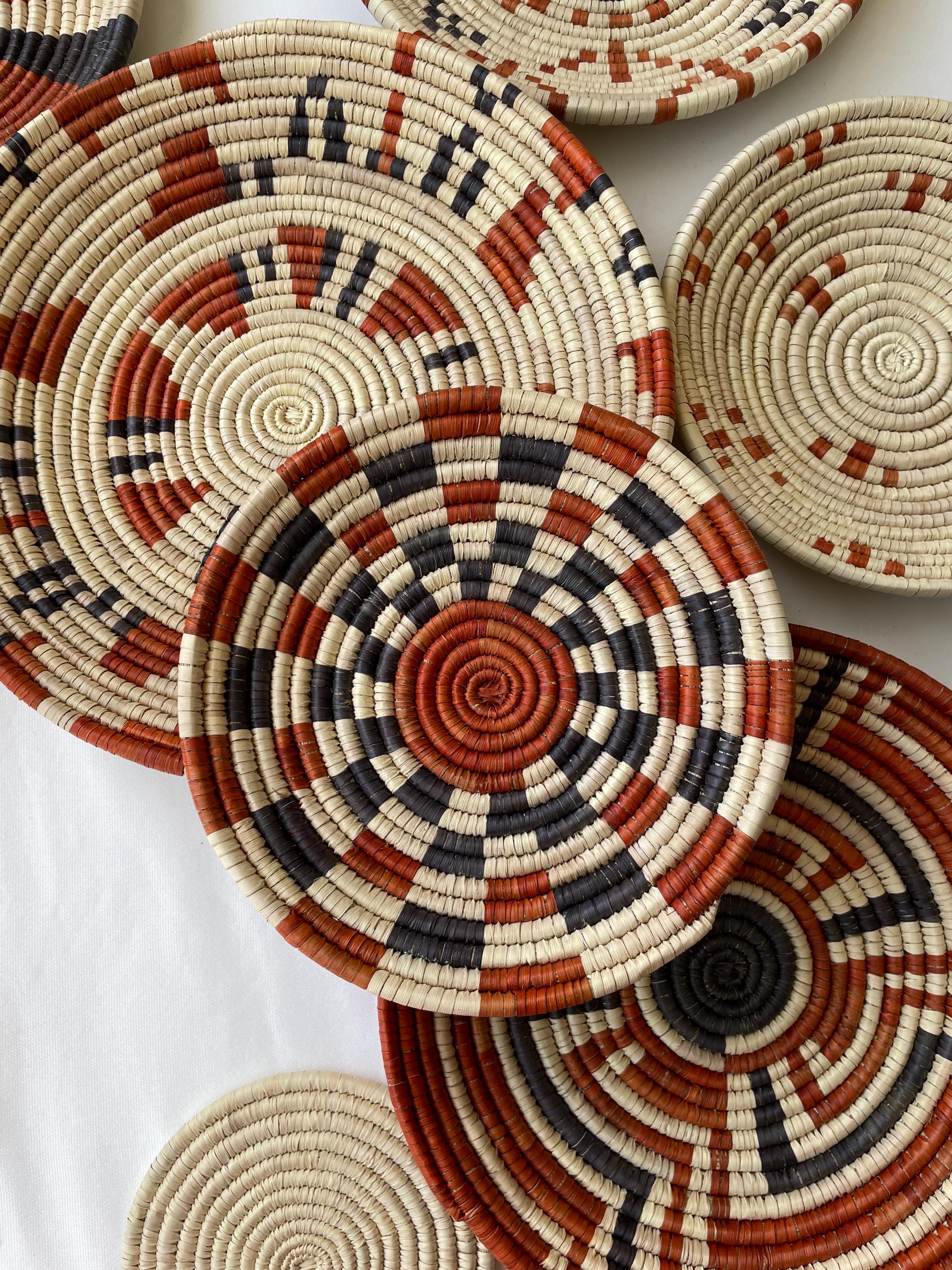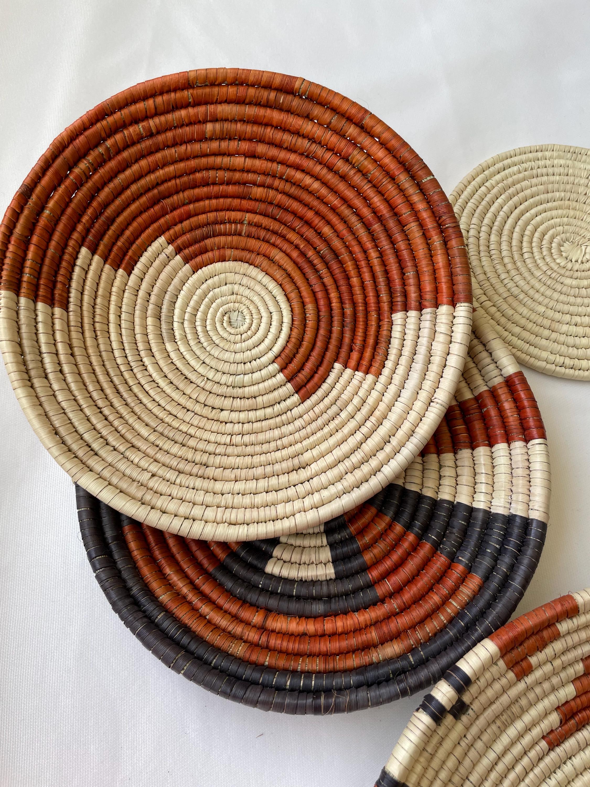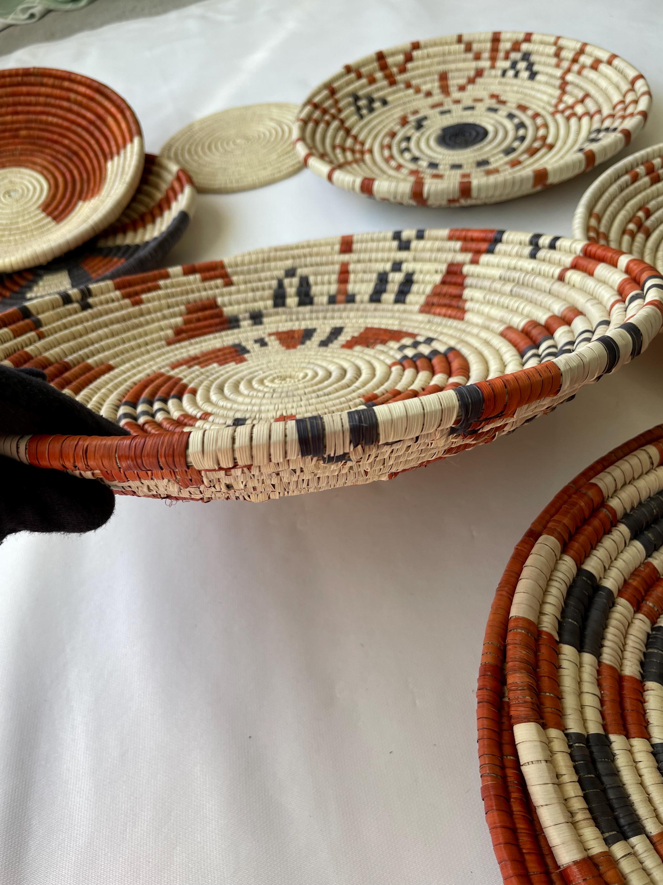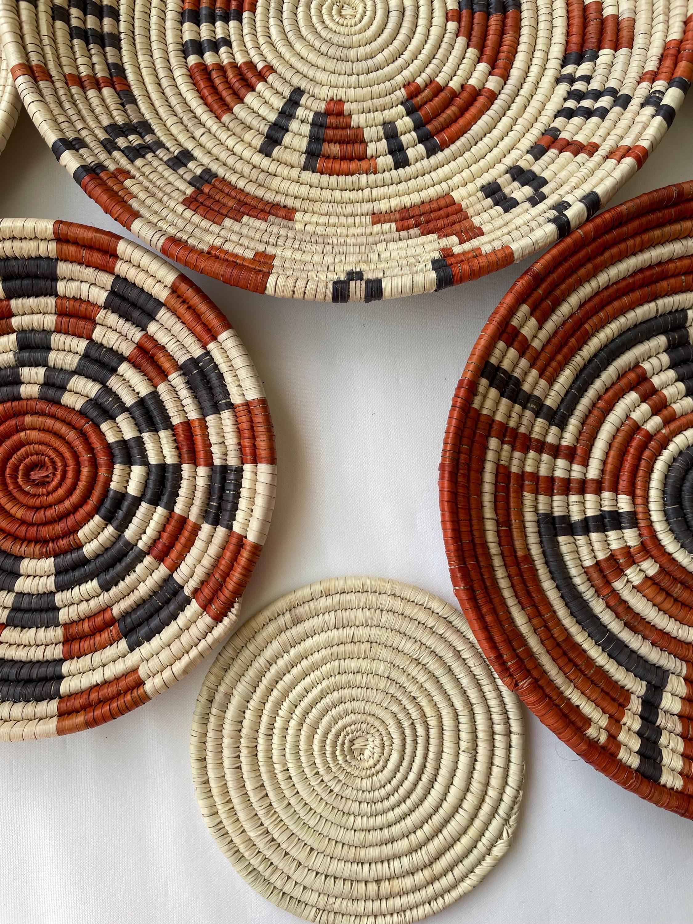 This set of nine boho wall baskets combines traditional craftsmanship with a contemporary aesthetic, featuring bold, striking patterns that bring an neutral colors to any room, these woven wall baskets add texture, depth, and a globally inspired touch to your decor.
