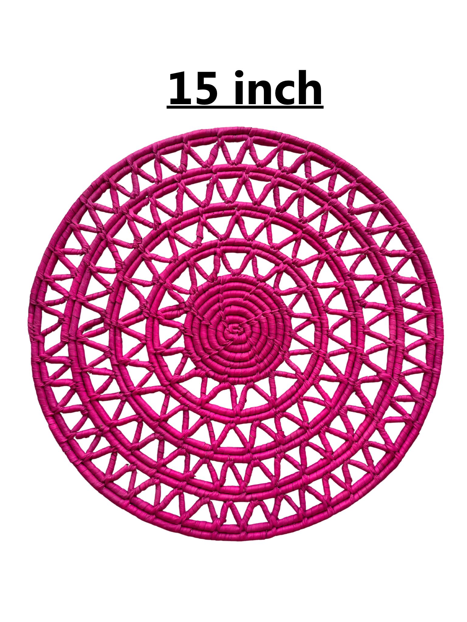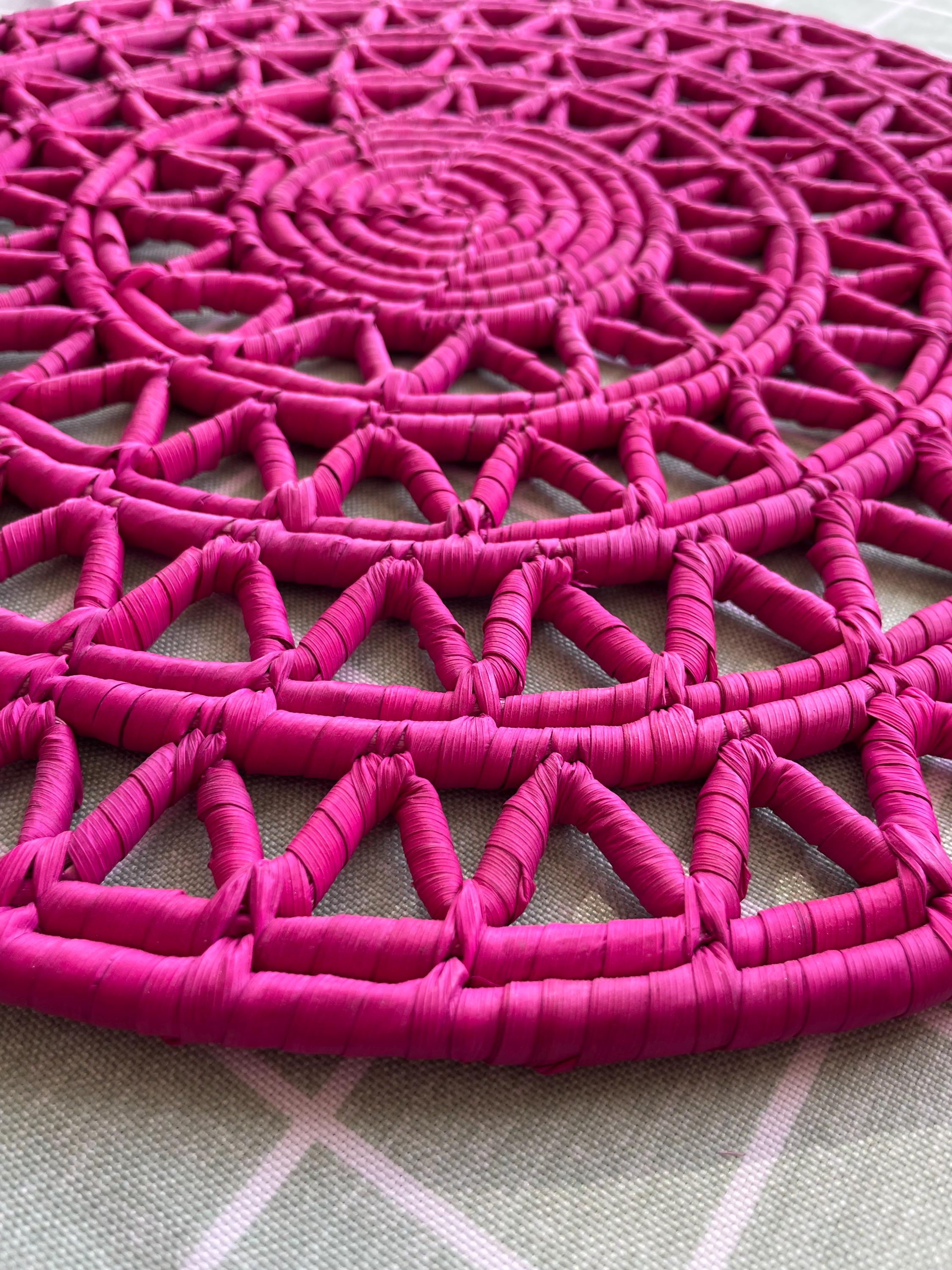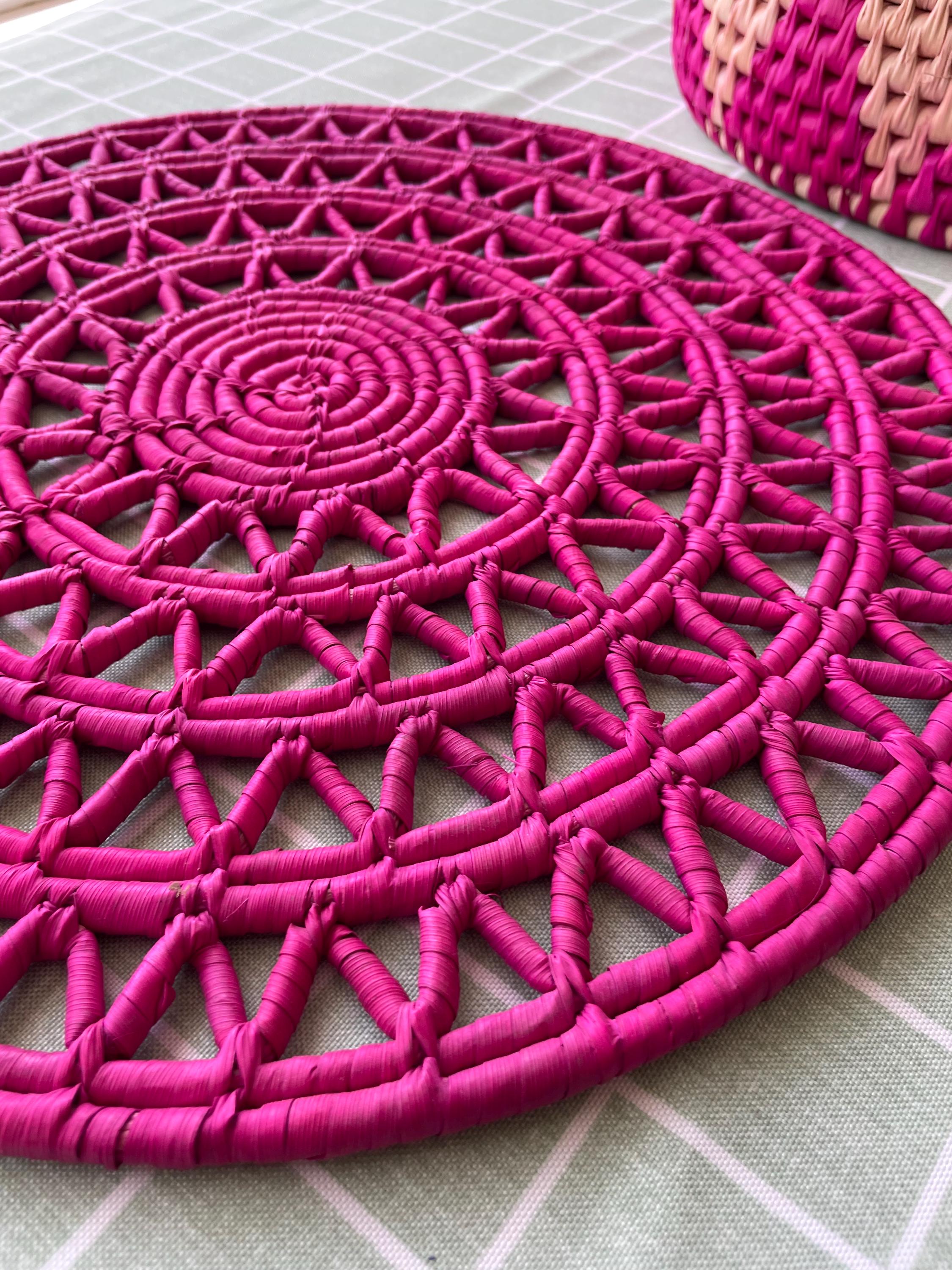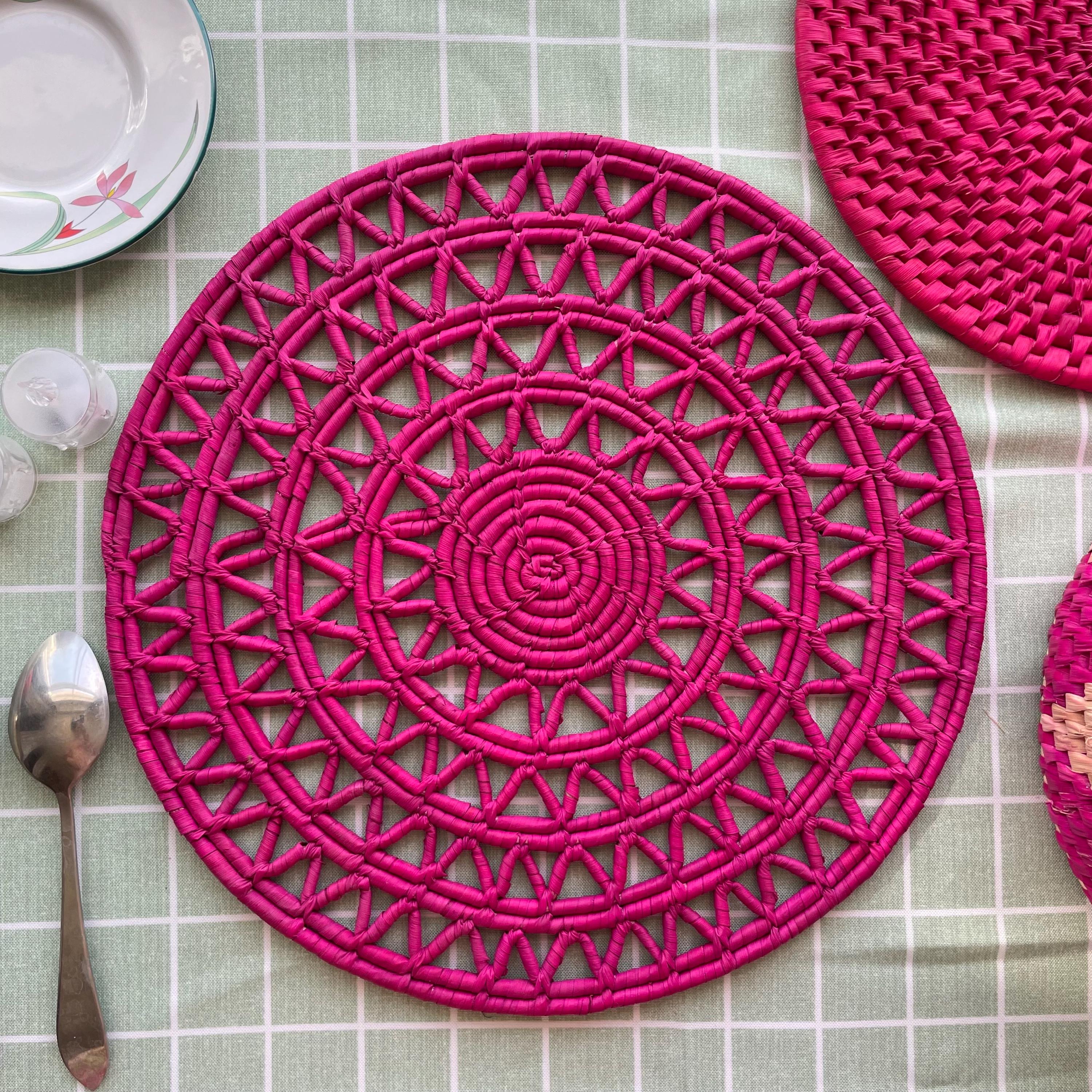 This pink woven placemat set is made from date palm fiber gathered from the various palm plantations that surround the artisans' village. Natural materials means that each boho placemat has its own unique color variations.